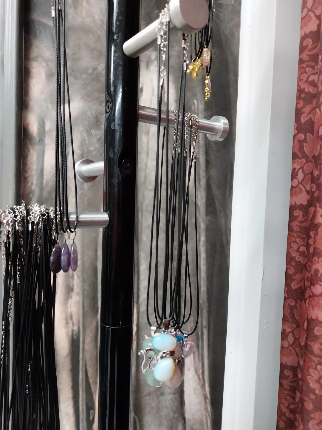 A collection of necklaces featuring various pendants, including stones, hearts, and charms like owls and eyes. Each necklace has a black cord and a silver-toned chain. These are great for adding a unique touch to any outfit!