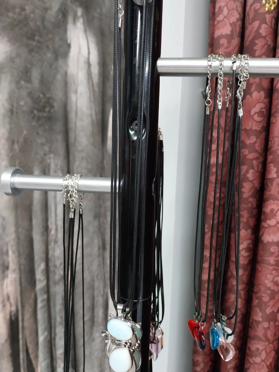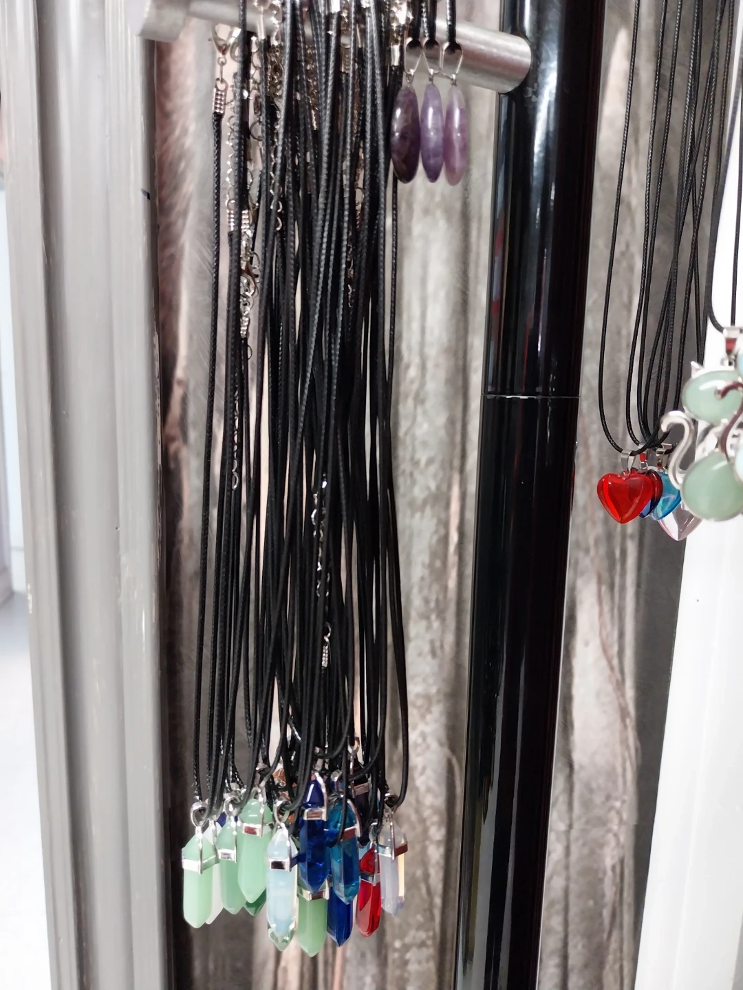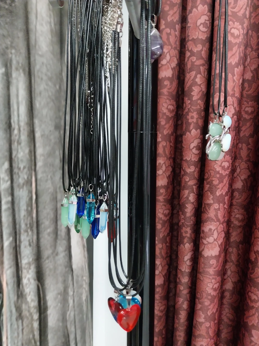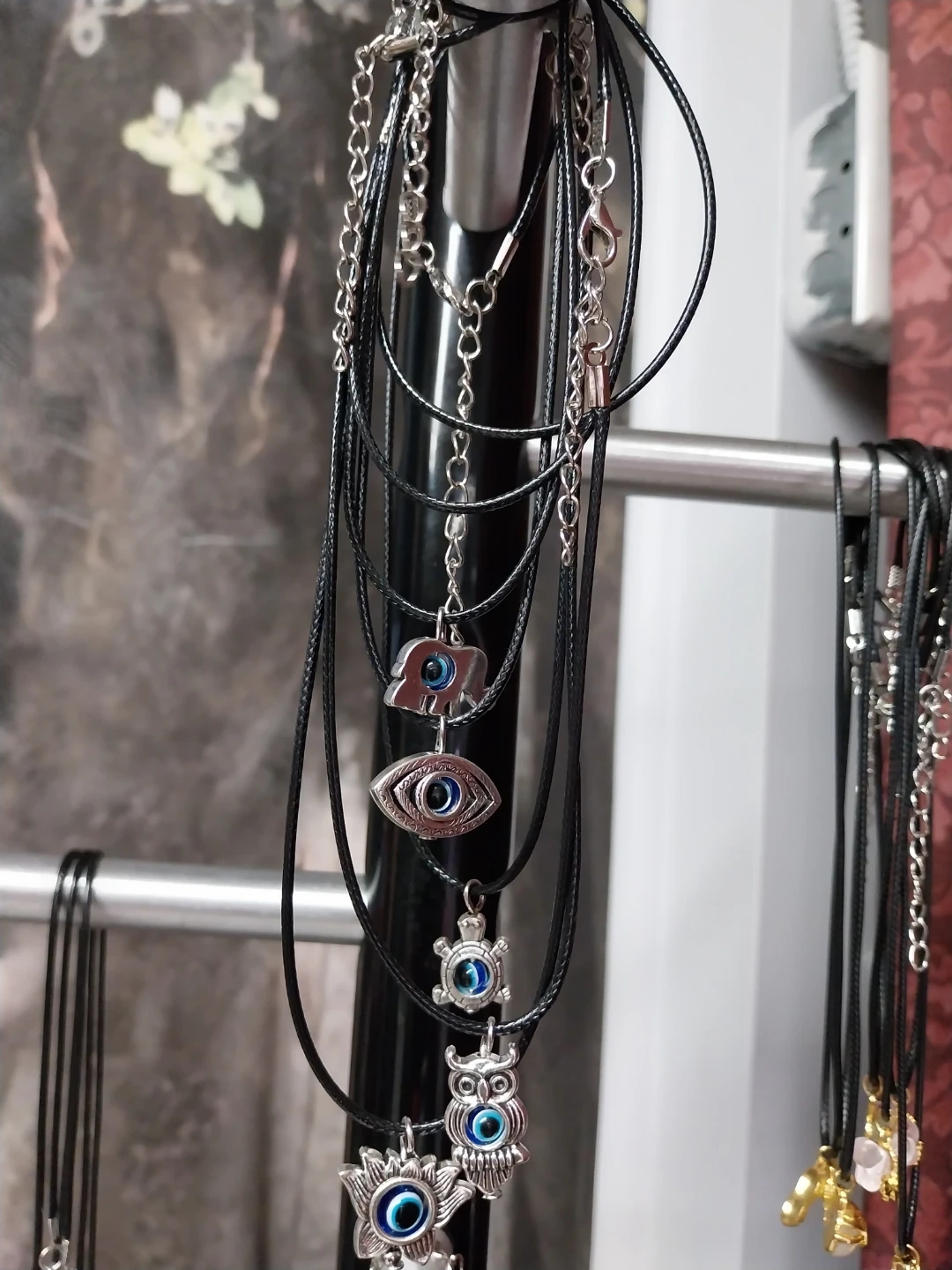 A collection of necklaces featuring various pendants, including stones, hearts, and charms like owls and eyes. Each necklace has a black cord and a silver-toned chain. These are great for adding a unique touch to any outfit!
