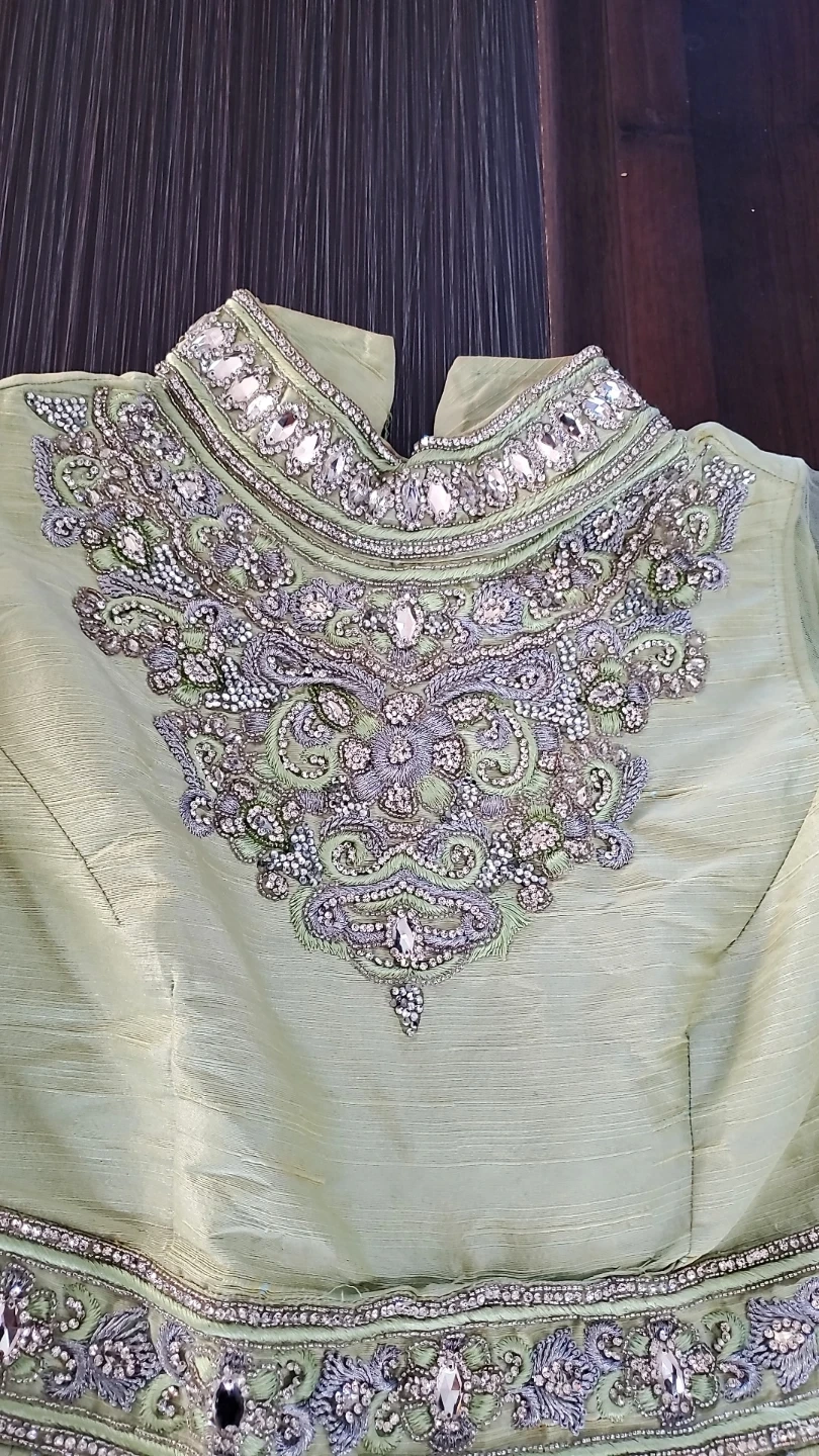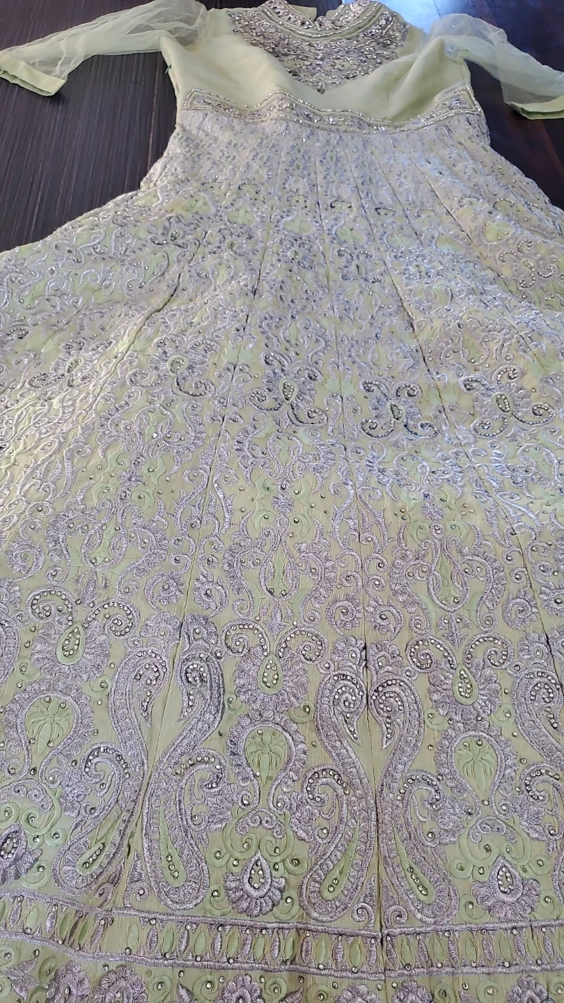 Beautiful light green Anarkali dress with intricate silver embellishments. Perfect for a special occasion! It's in great condition and ready to wear.