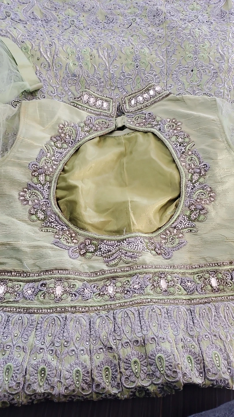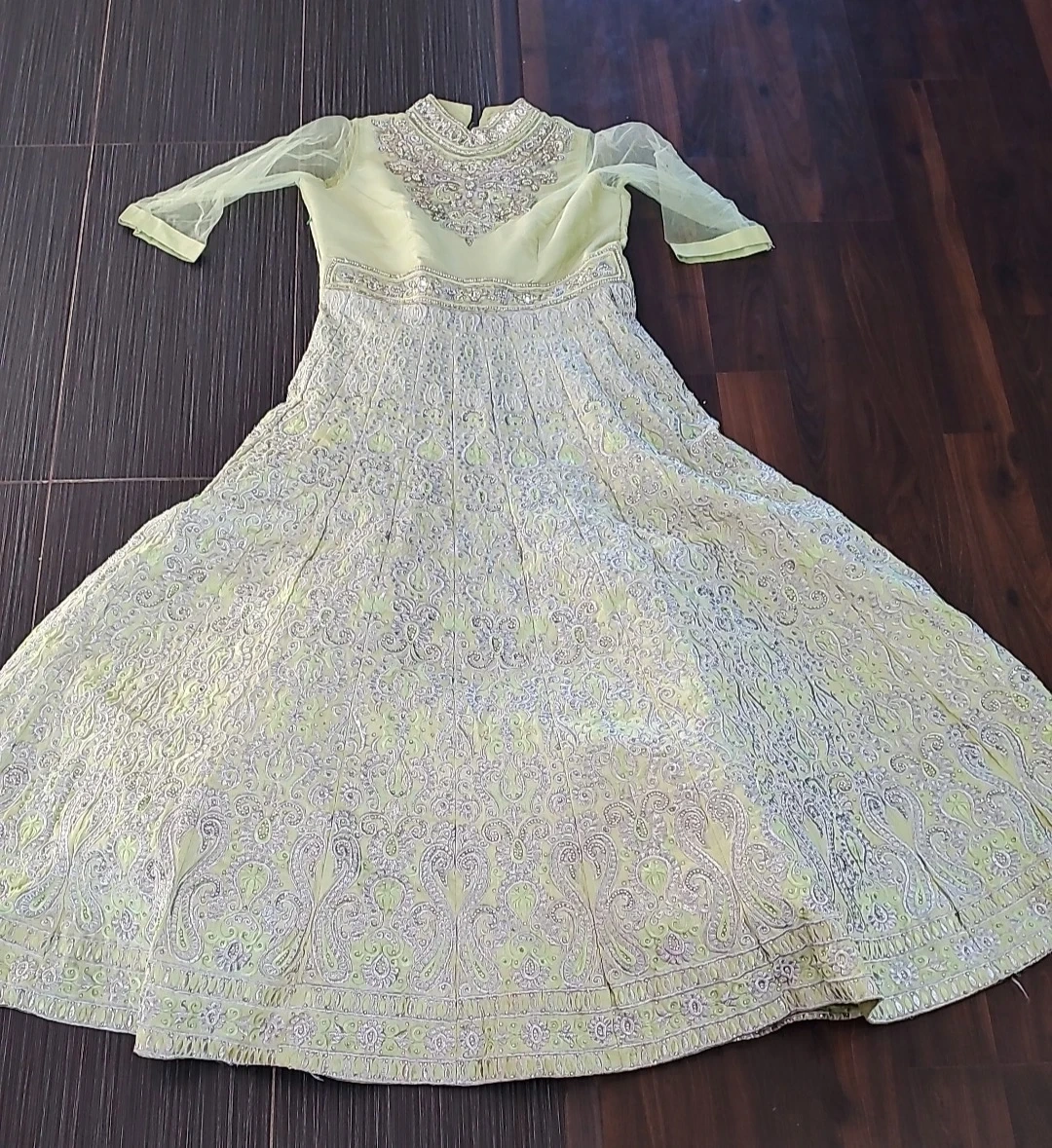 Beautiful light green Anarkali dress with intricate silver embellishments. Perfect for a special occasion! It's in great condition and ready to wear.