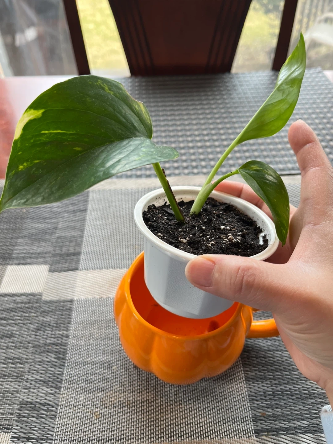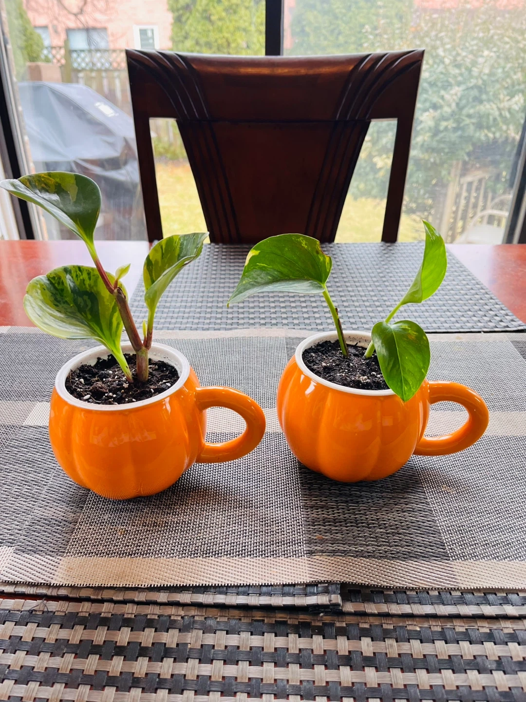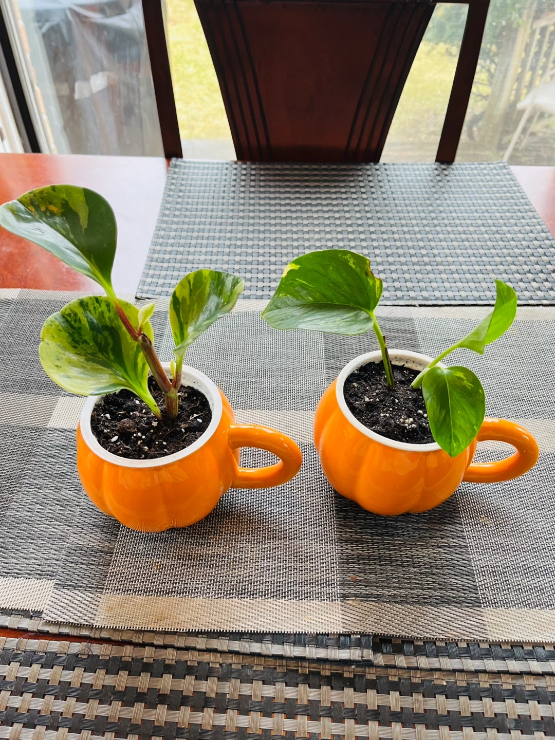 PLANT SET for $13 (not sold separately). Peperomia Marble and Golden Pothos in a decorative pumpkin shaped pot mug. Potted Mar20. Pop can in picture for size comparison.
