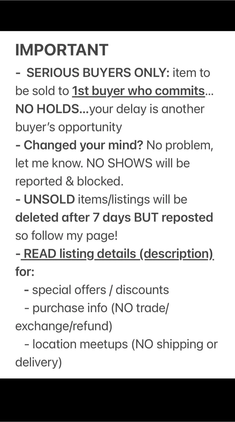 SERIOUS BUYERS ONLY / FINAL SALE / Cash Payment at pickup / NO HOLDS (Items will be sold on a FIRST-COME/PAYMENT-FIRST-SERVE basis!)