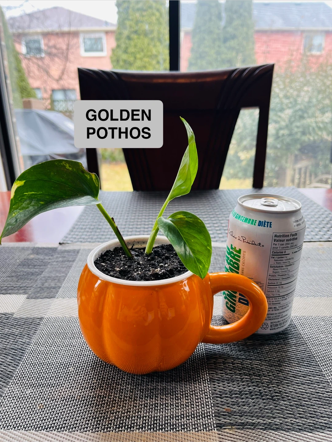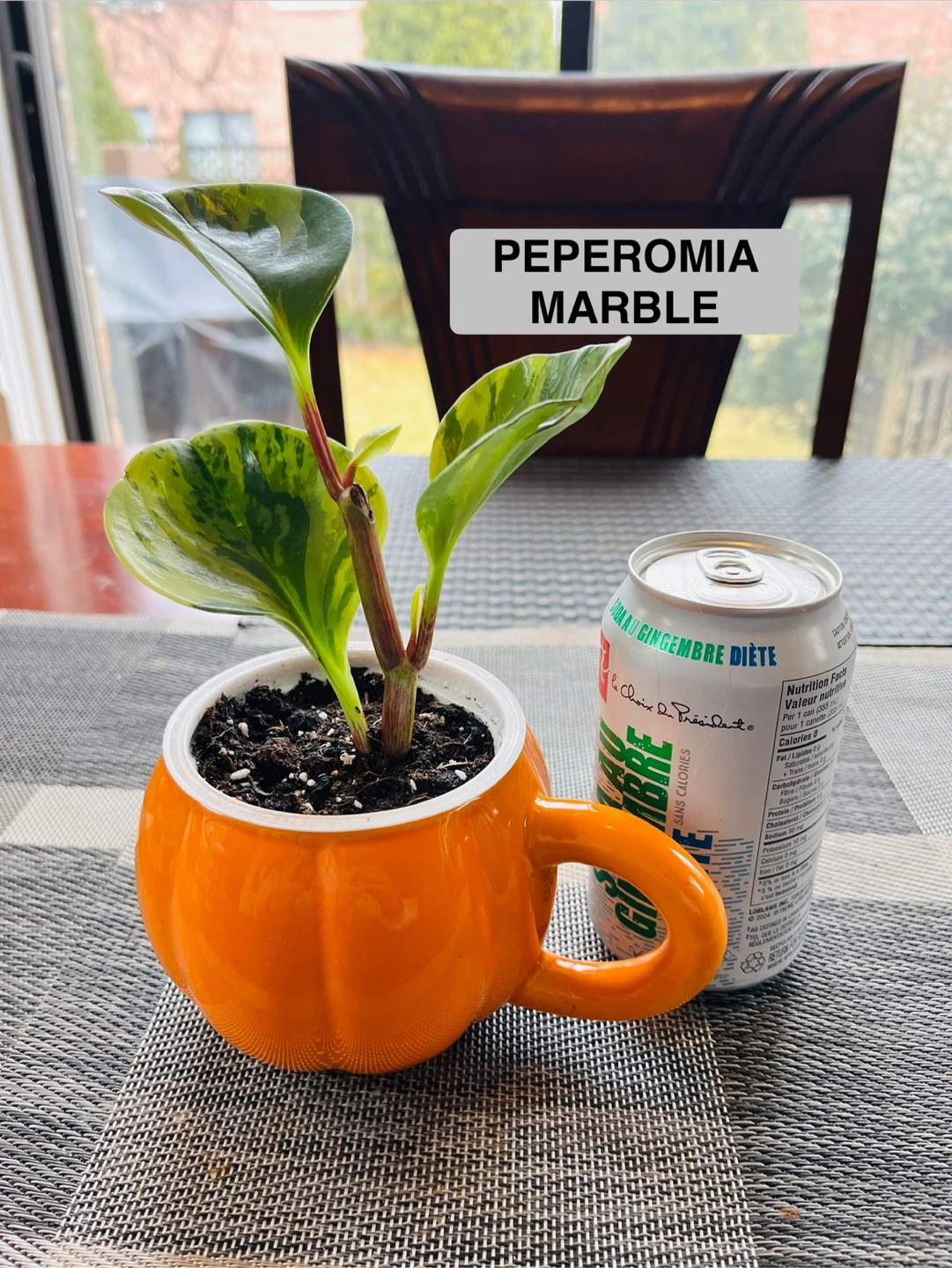 PLANT SET for $13 (not sold separately). Peperomia Marble and Golden Pothos in a decorative pumpkin shaped pot mug. Potted Mar20. Pop can in picture for size comparison.