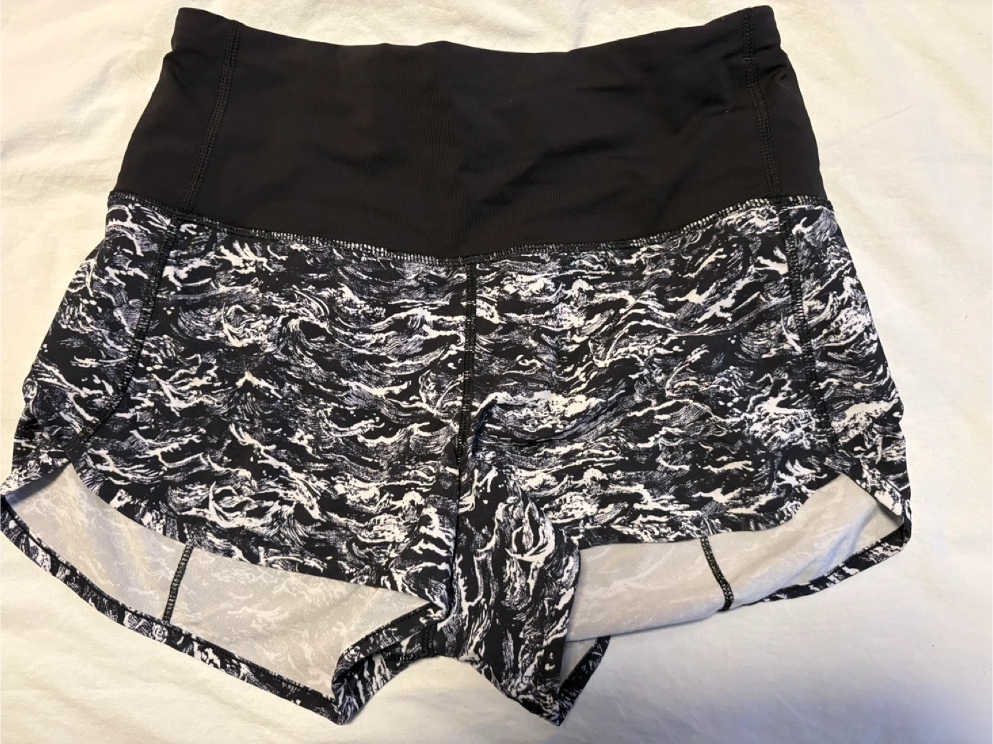 Lululemon running shorts feature a stylish black and white wave/ocean pattern.
