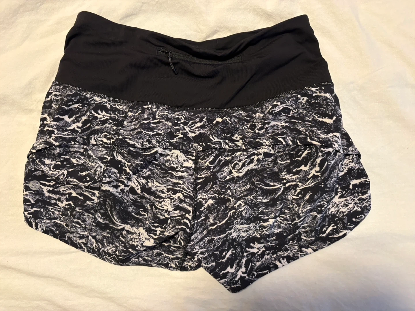 Lululemon running shorts feature a stylish black and white wave/ocean pattern.