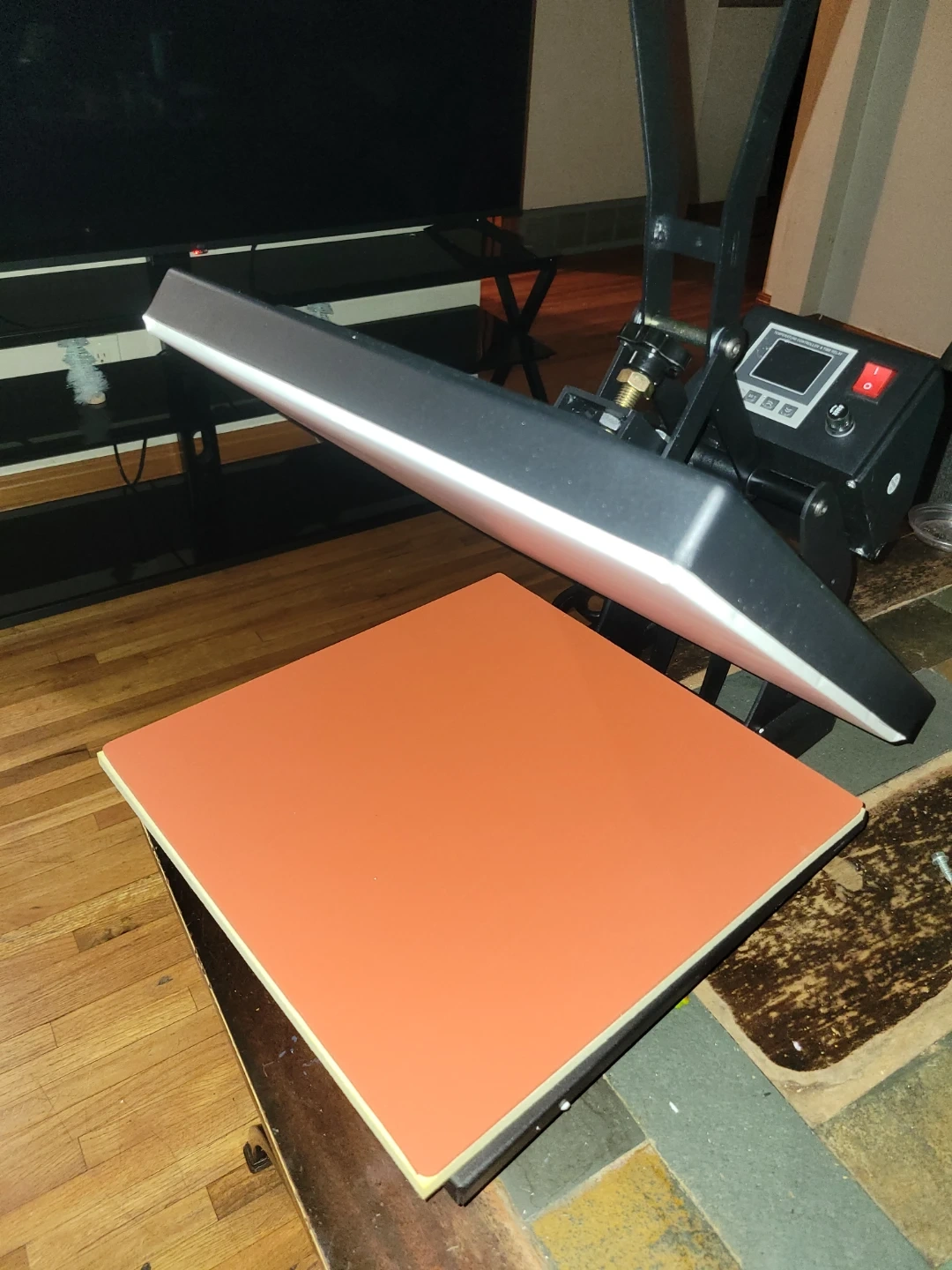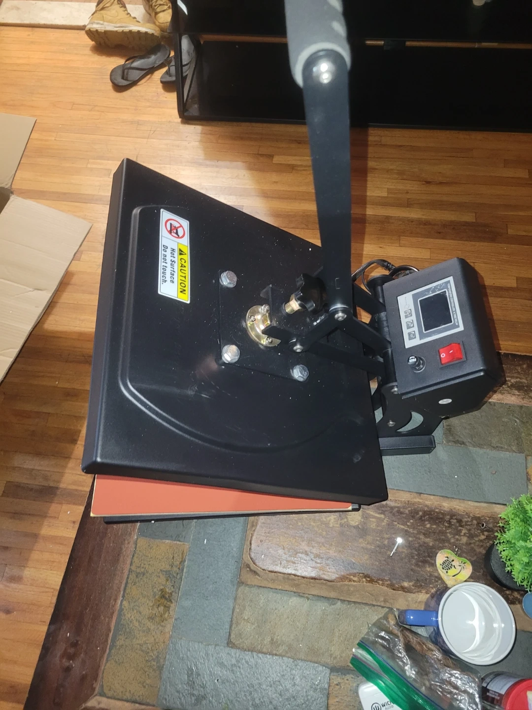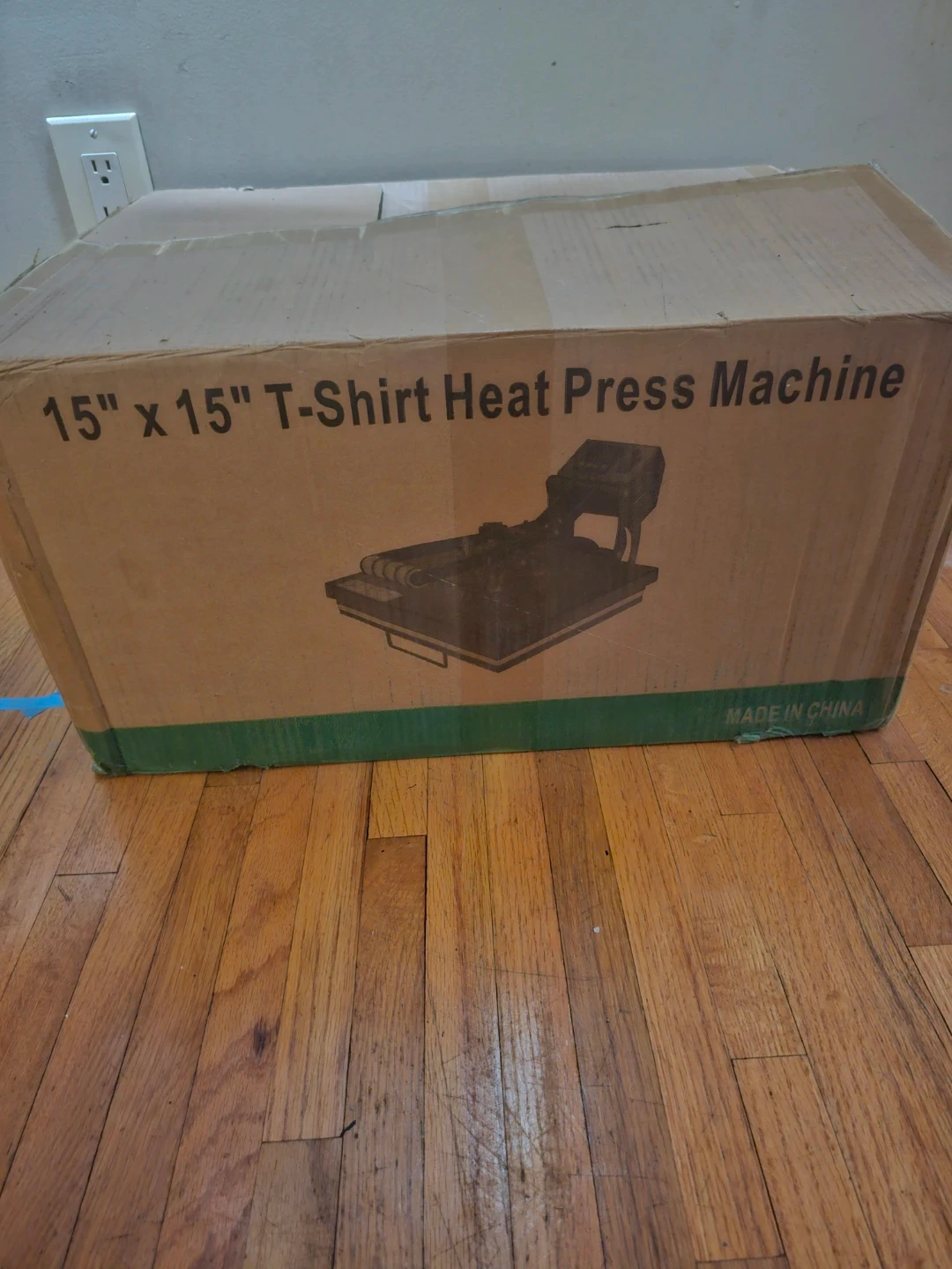 This is a 15" by 15" T-shirt heat press machine. It features a digital display for temperature and time control. The machine is made in China.