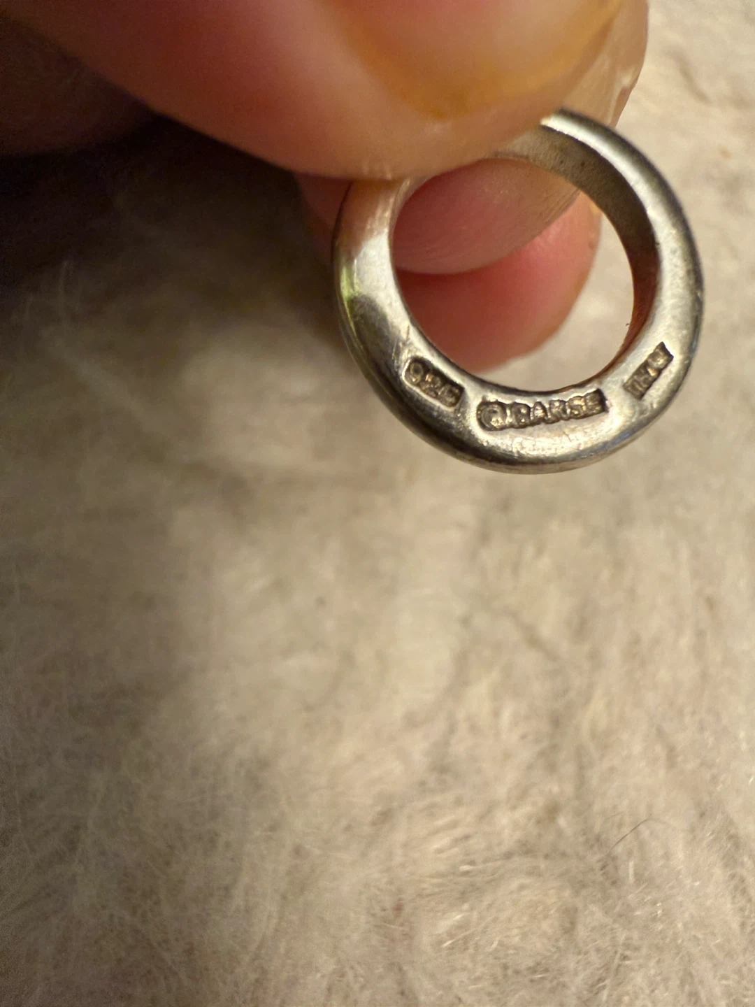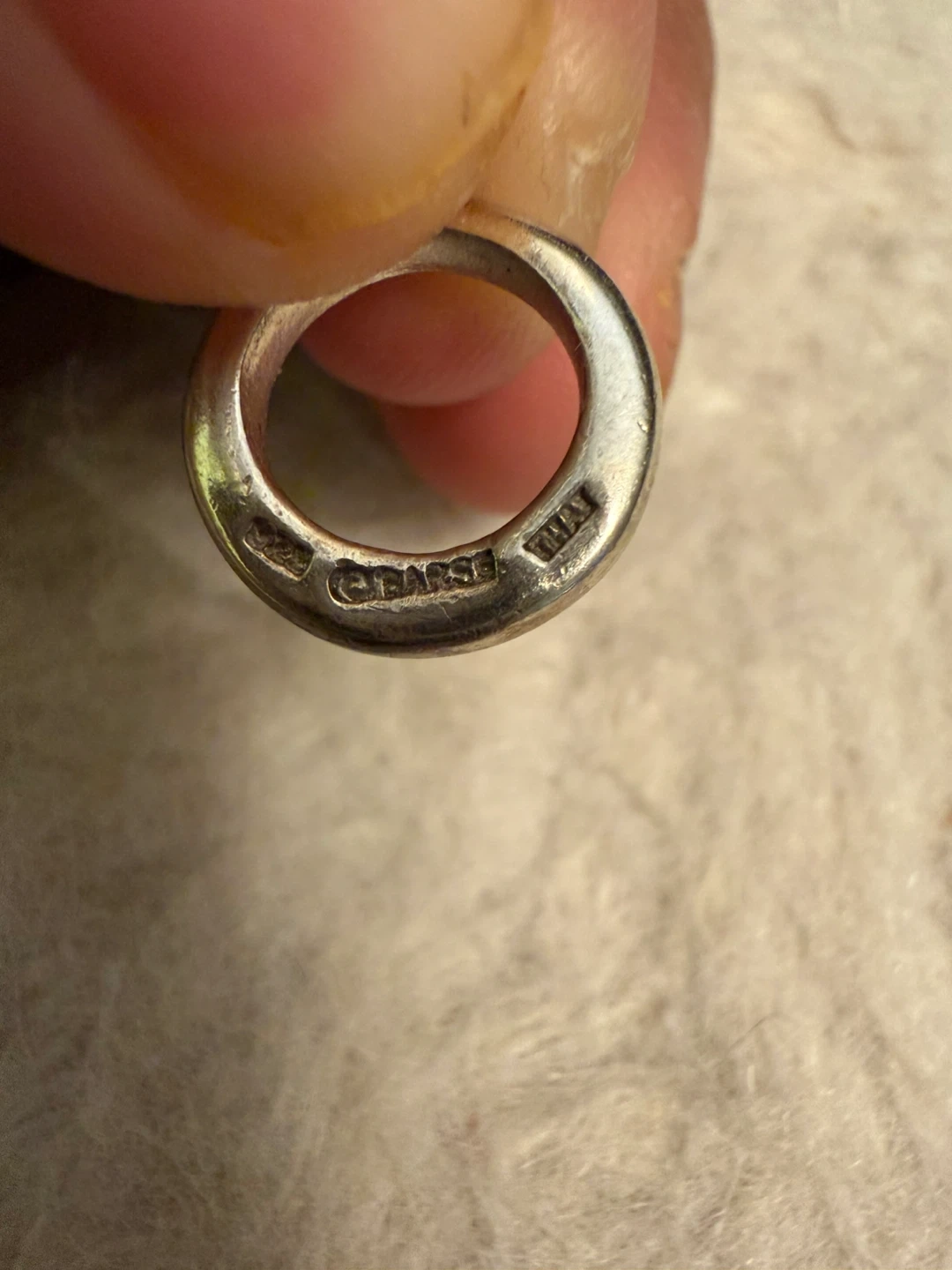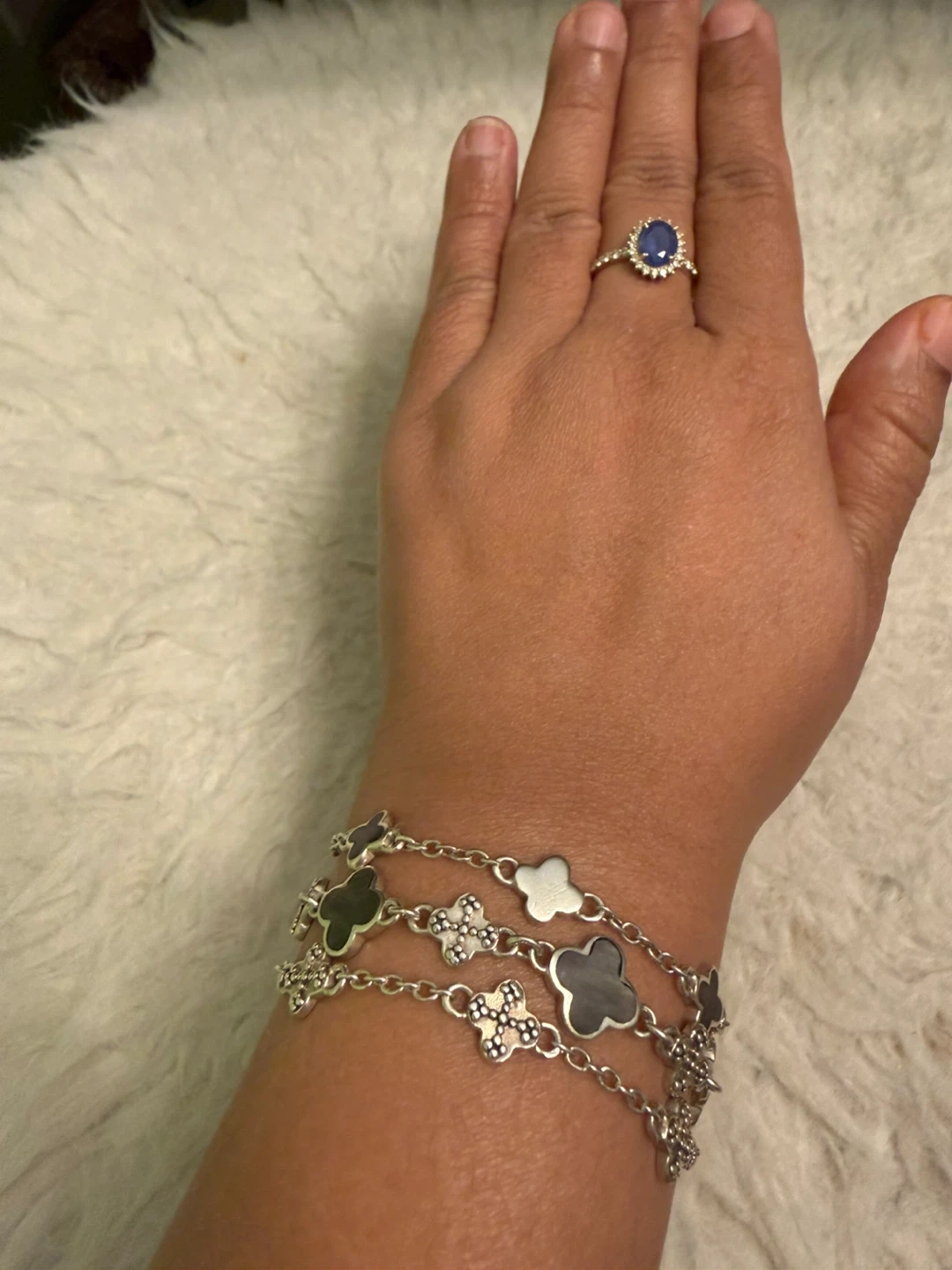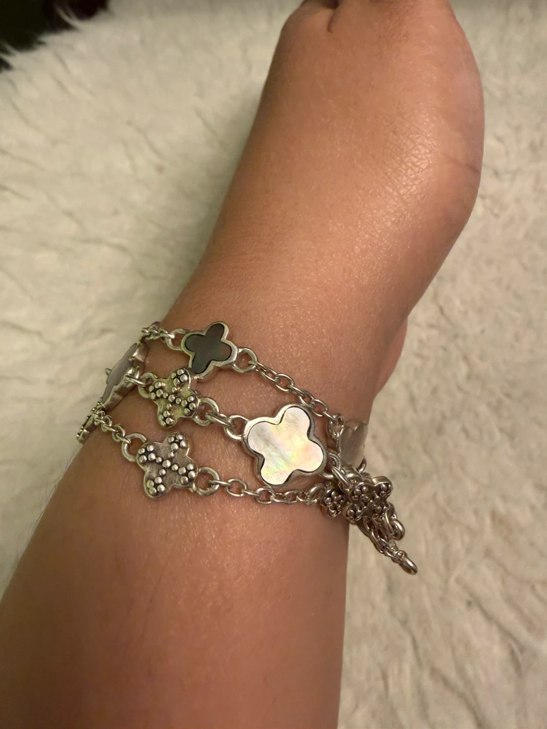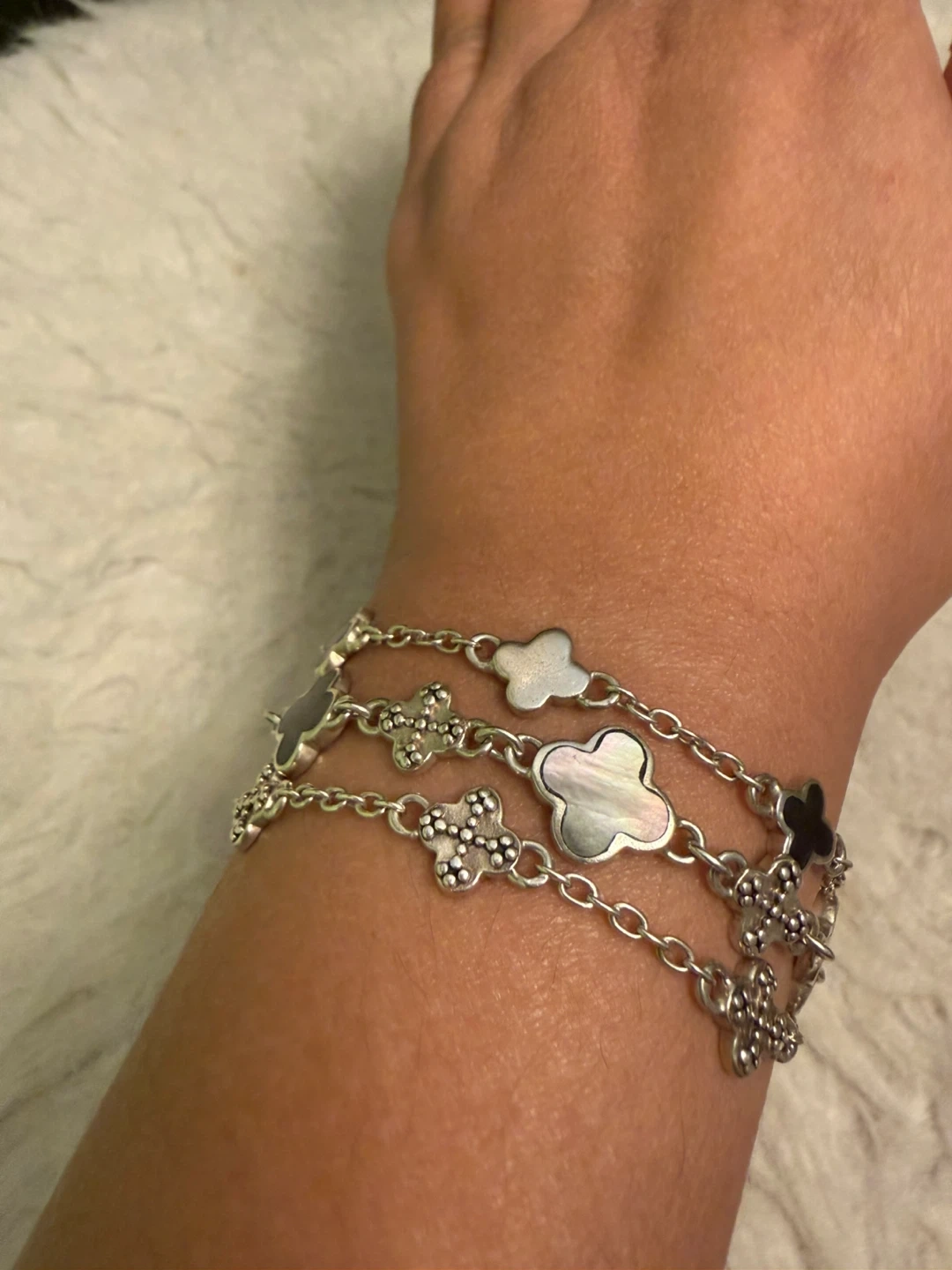 Three-strand sterling silver bracelet with clover charms. It's accented with mother-of-pearl and silver detail.