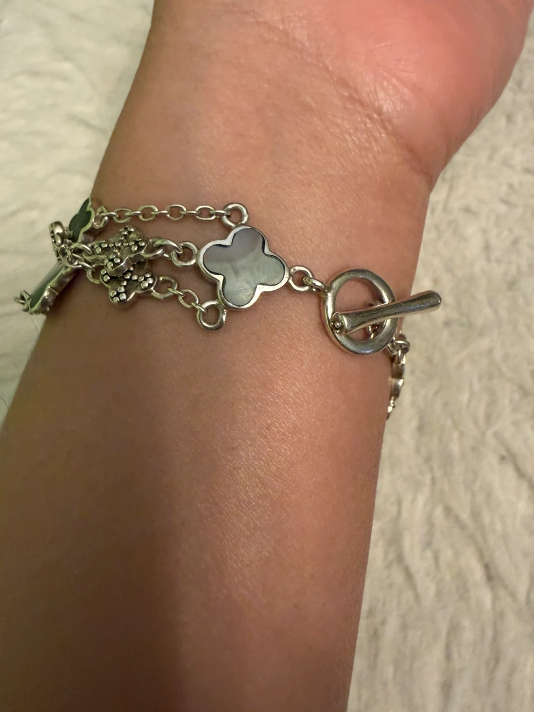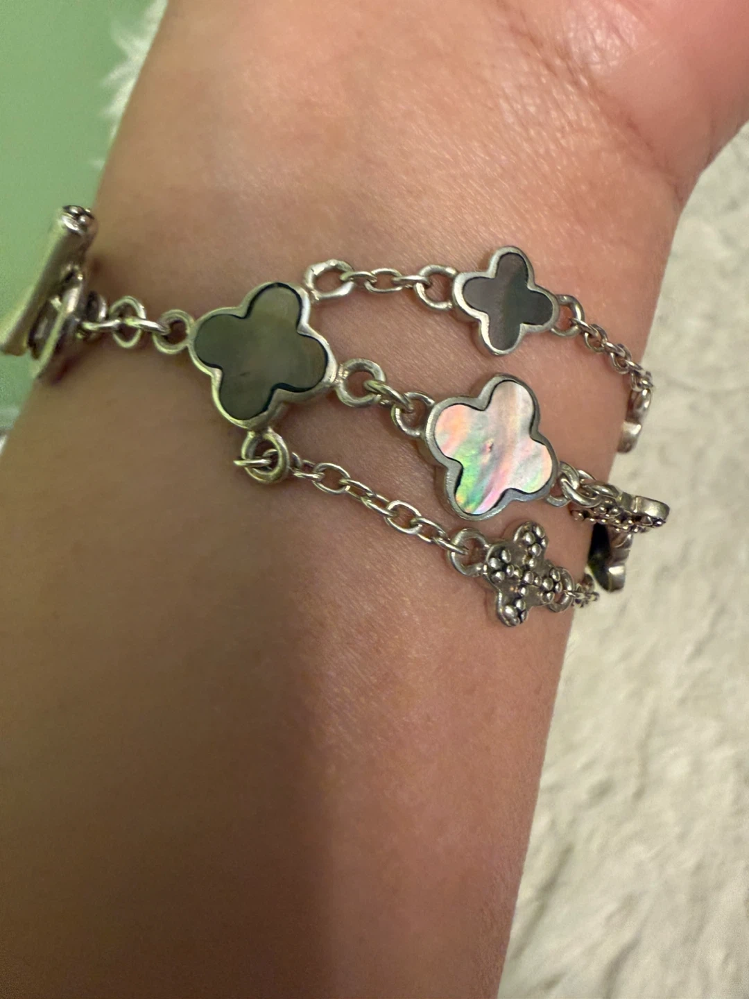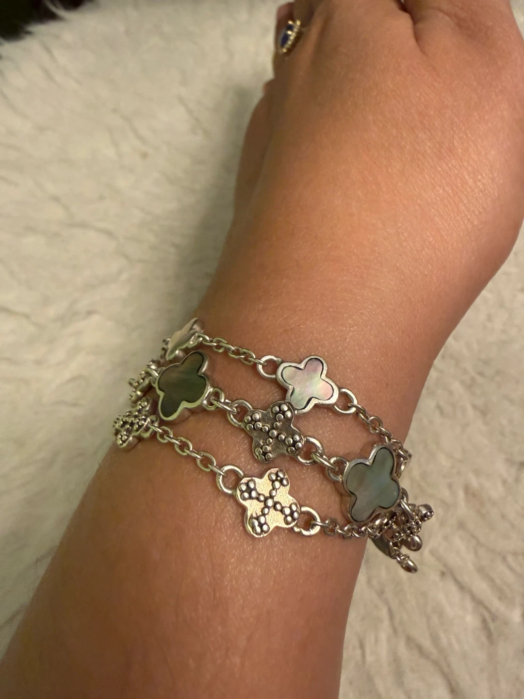 Three-strand sterling silver bracelet with clover charms. It's accented with mother-of-pearl and silver detail.
