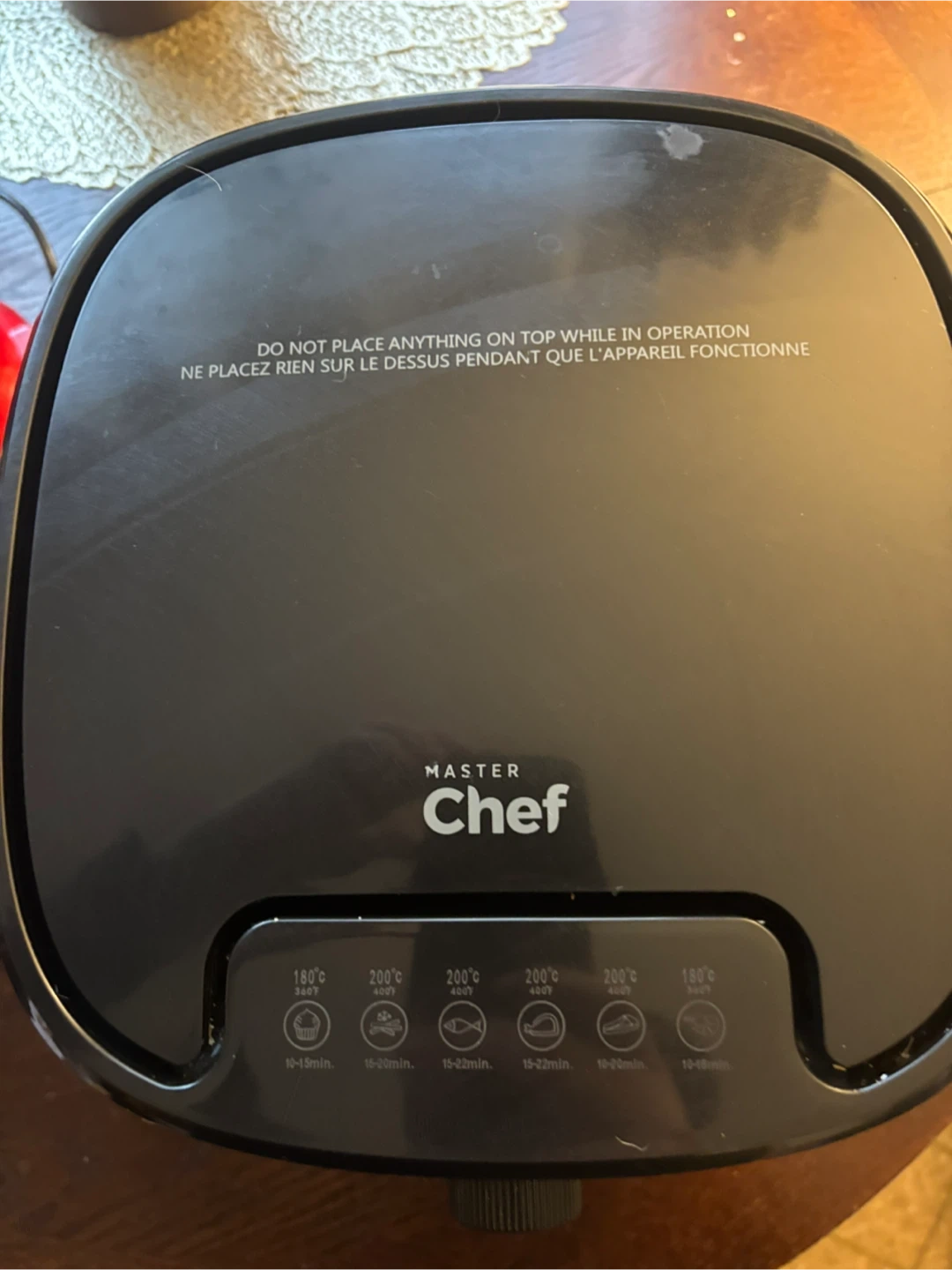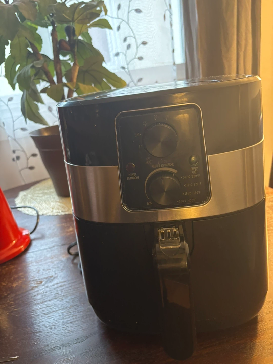 Black air fryer with a removable basket and drawer. It has two knobs for temperature and timer settings. Ready indicator light included. 140°C-200°C (280°F-400°F) temperature range. This appliance is great for quick and easy cooking.
