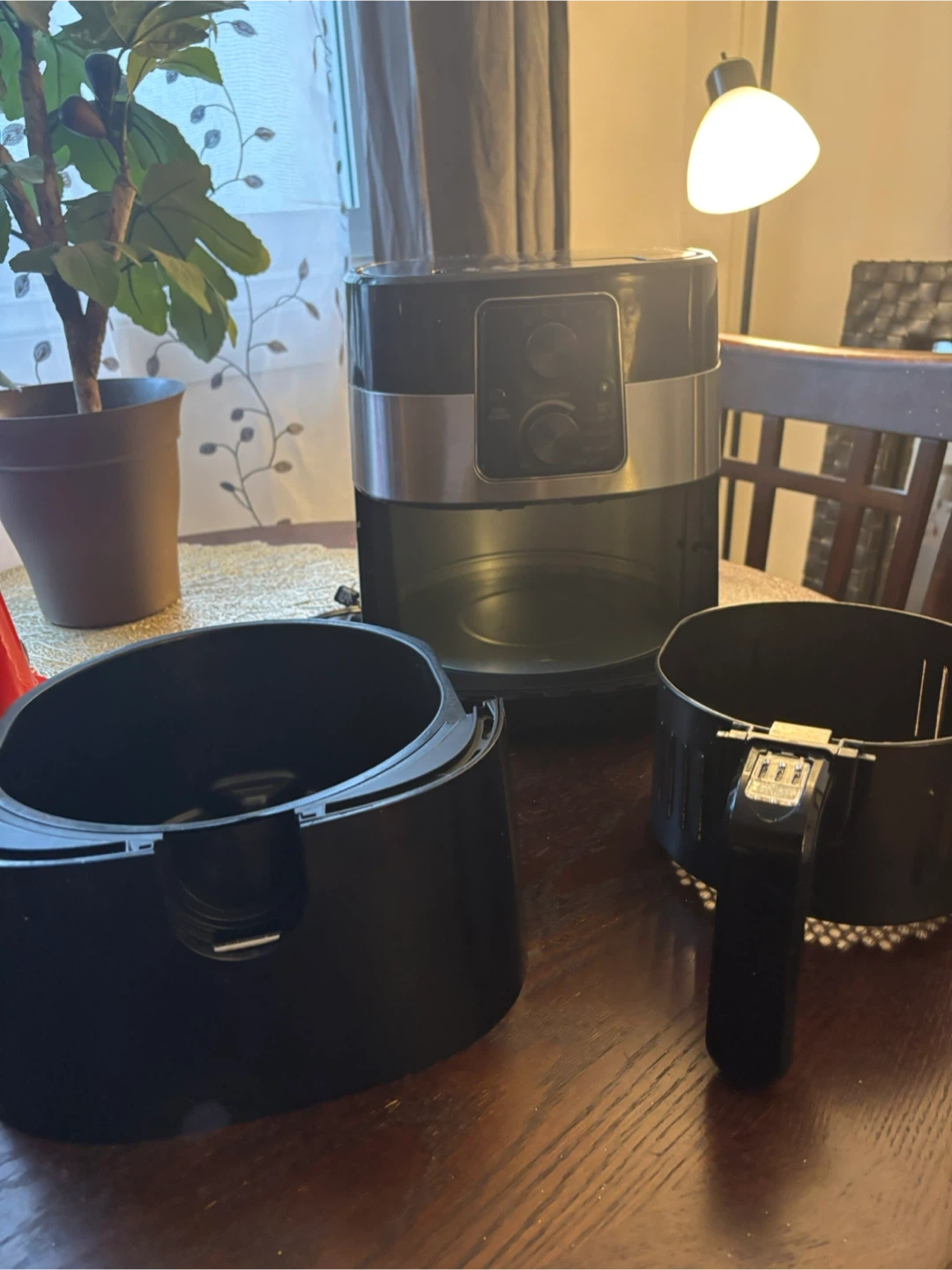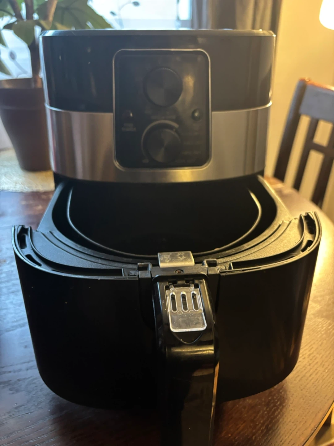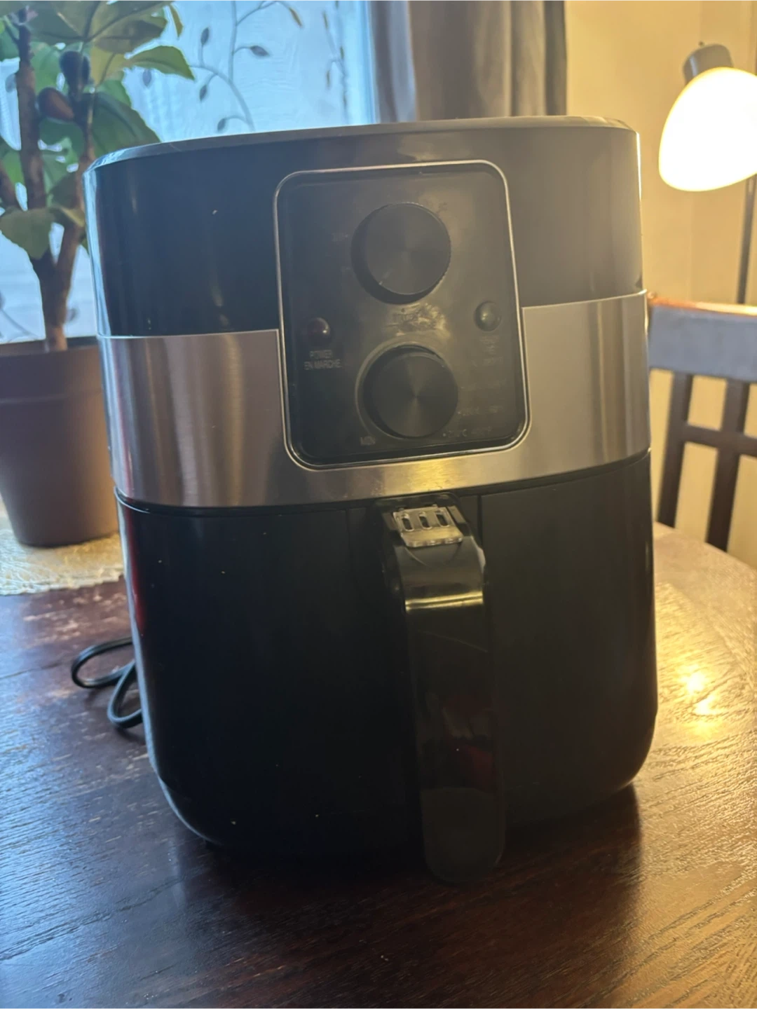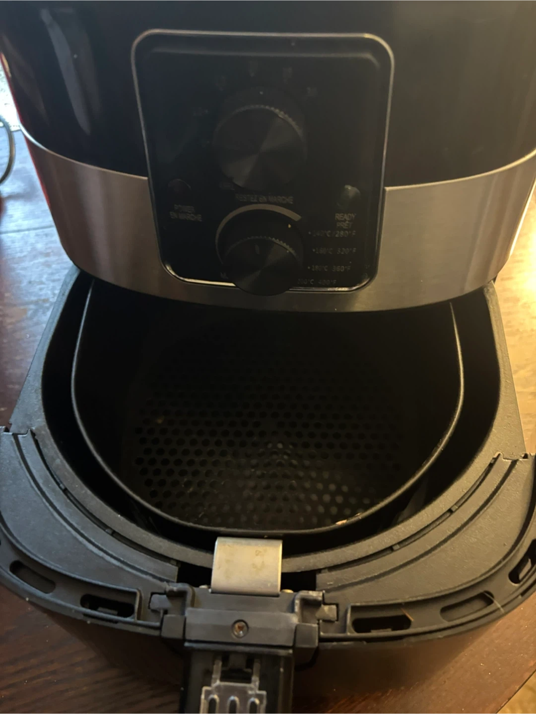 Black air fryer with a removable basket and drawer. It has two knobs for temperature and timer settings. Ready indicator light included. 140°C-200°C (280°F-400°F) temperature range. This appliance is great for quick and easy cooking.