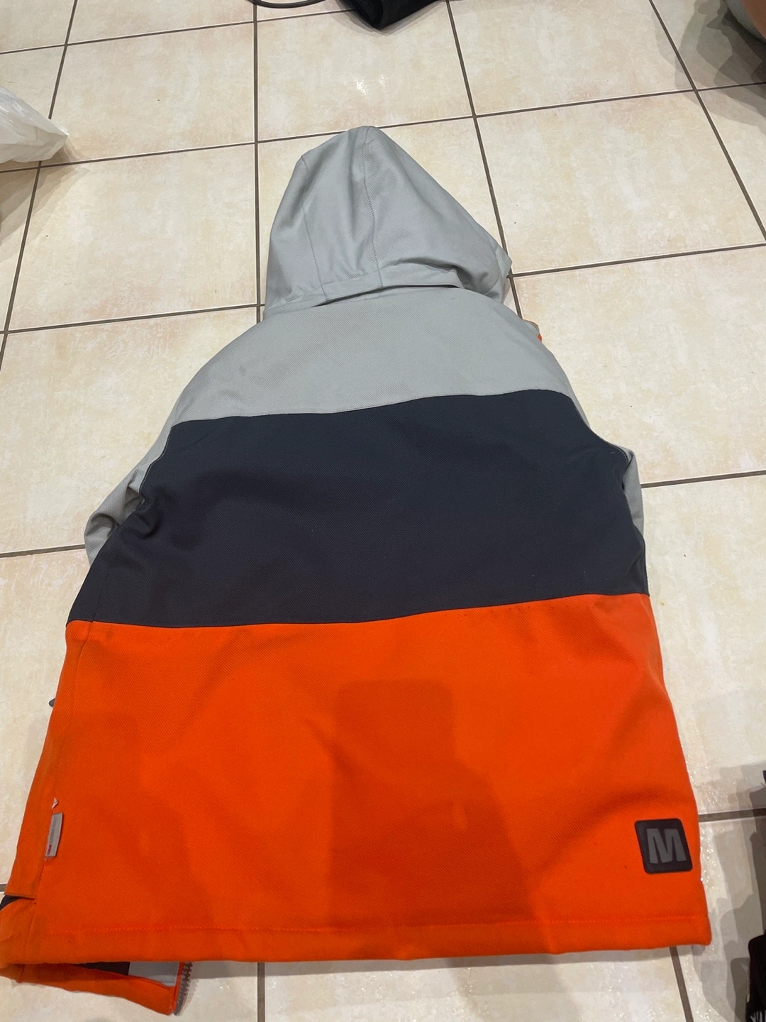 The jacket features a grey, black, and orange colour block design. The pants are black with a grey camo pattern.