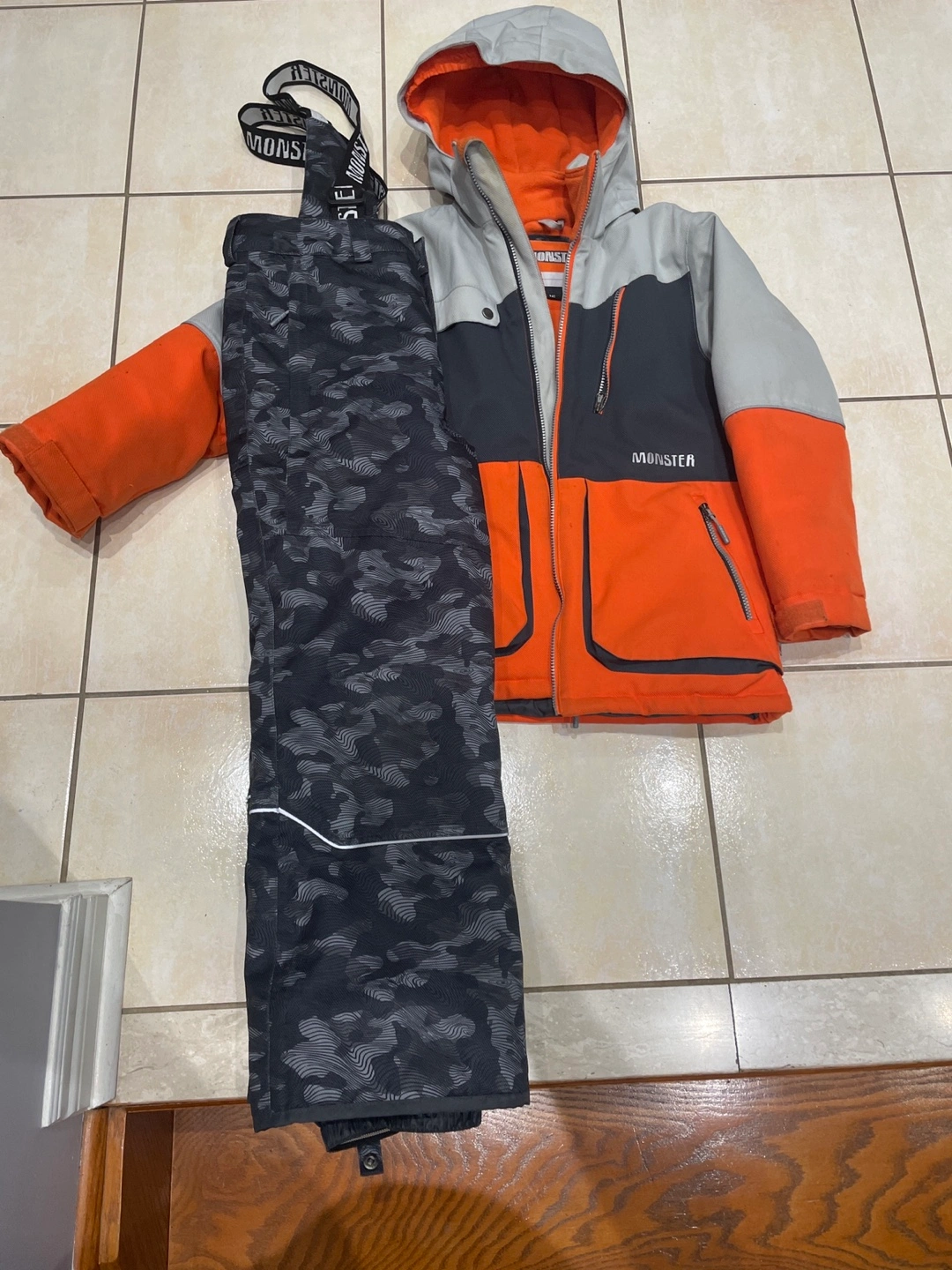 Selling a Monster brand ski jacket and pants set.