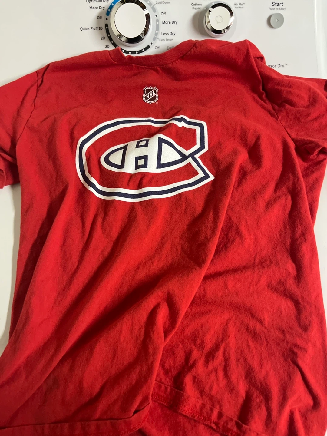 Selling a red NHL t-shirt featuring the Montreal Canadiens logo. It's a vibrant red colour! A great shirt for any hockey fan.