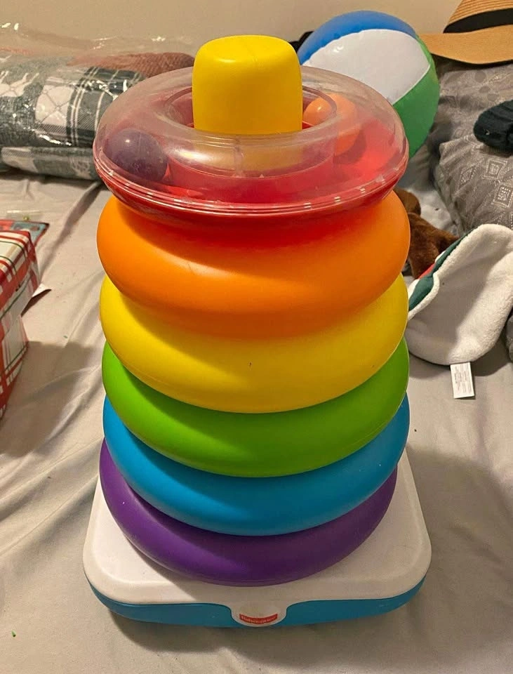 Excellent condition set of colorful stacking rings for babies. This classic developmental toy features a rocking base and five rings of various sizes and textures to help with fine motor skills and hand-eye coordination. Barely used, clean, and sanitized. BPA-free plastic. From a smoke-free and pet-free home. Pickup only at Sheppard & Bayview.
