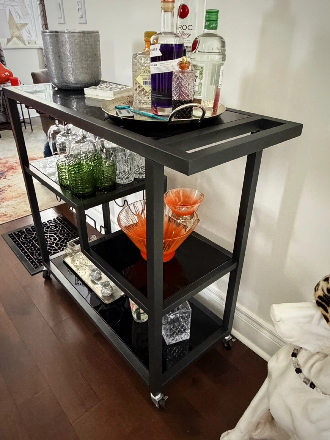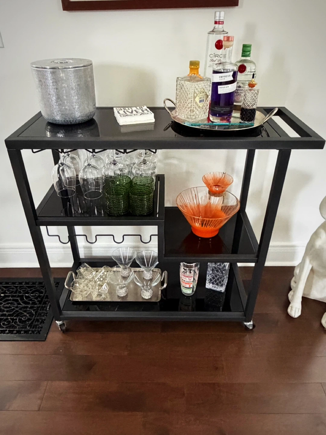 A stylish 3-tier bar cart for your home. It features a wine glass rack and ample shelving for bottles and accessories. Dimensions are 39.5" wide, 15.75" deep, and 37.75" high. This cart is perfect for entertaining guests.