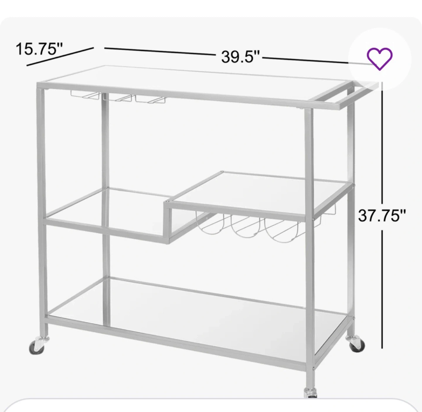 A stylish 3-tier bar cart for your home. It features a wine glass rack and ample shelving for bottles and accessories. Dimensions are 39.5" wide, 15.75" deep, and 37.75" high. This cart is perfect for entertaining guests.