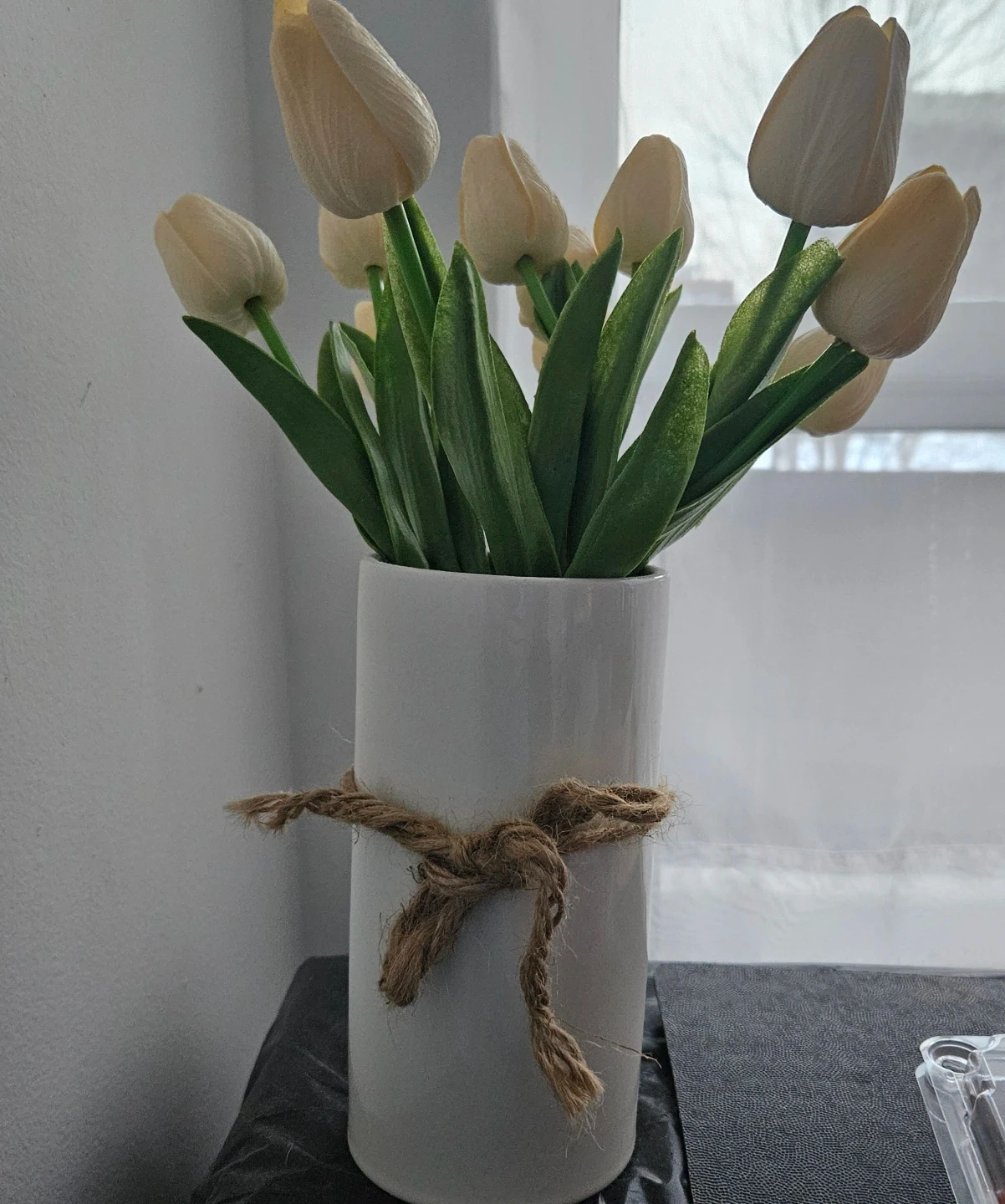 This white ceramic vase features a rustic jute tie accent and holds a bouquet of faux tulips. It's perfect for adding a touch of farmhouse charm to any room. The vase has a clean, modern cylindrical shape.