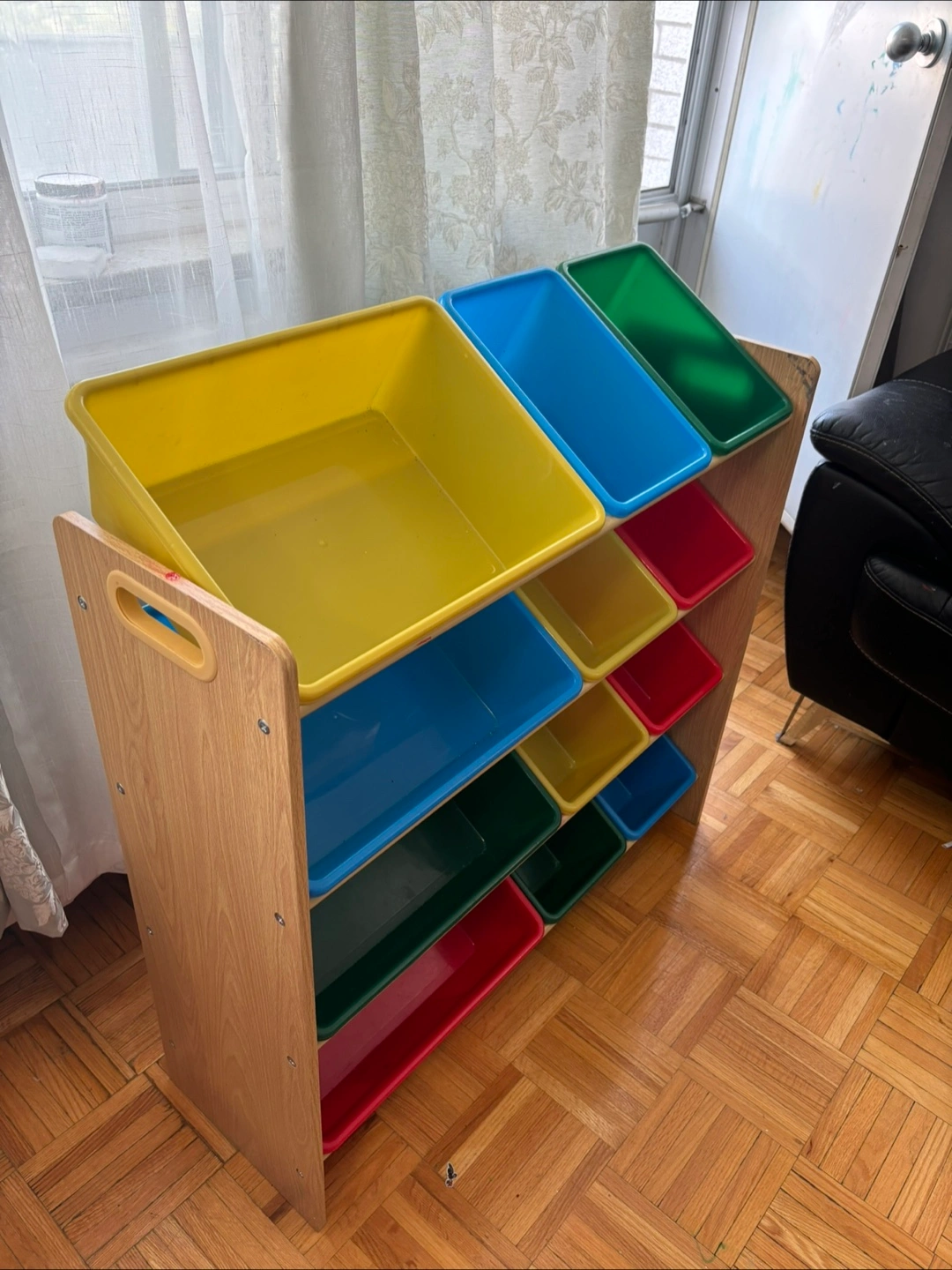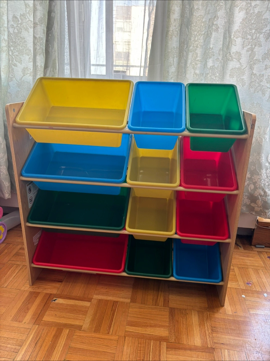 Selling a gently used storage unit. It comes with a variety of colourful bins, perfect for organizing toys or other items in a kid's room or playroom. This unit is sturdy and in great condition, ready to help keep your space tidy!
