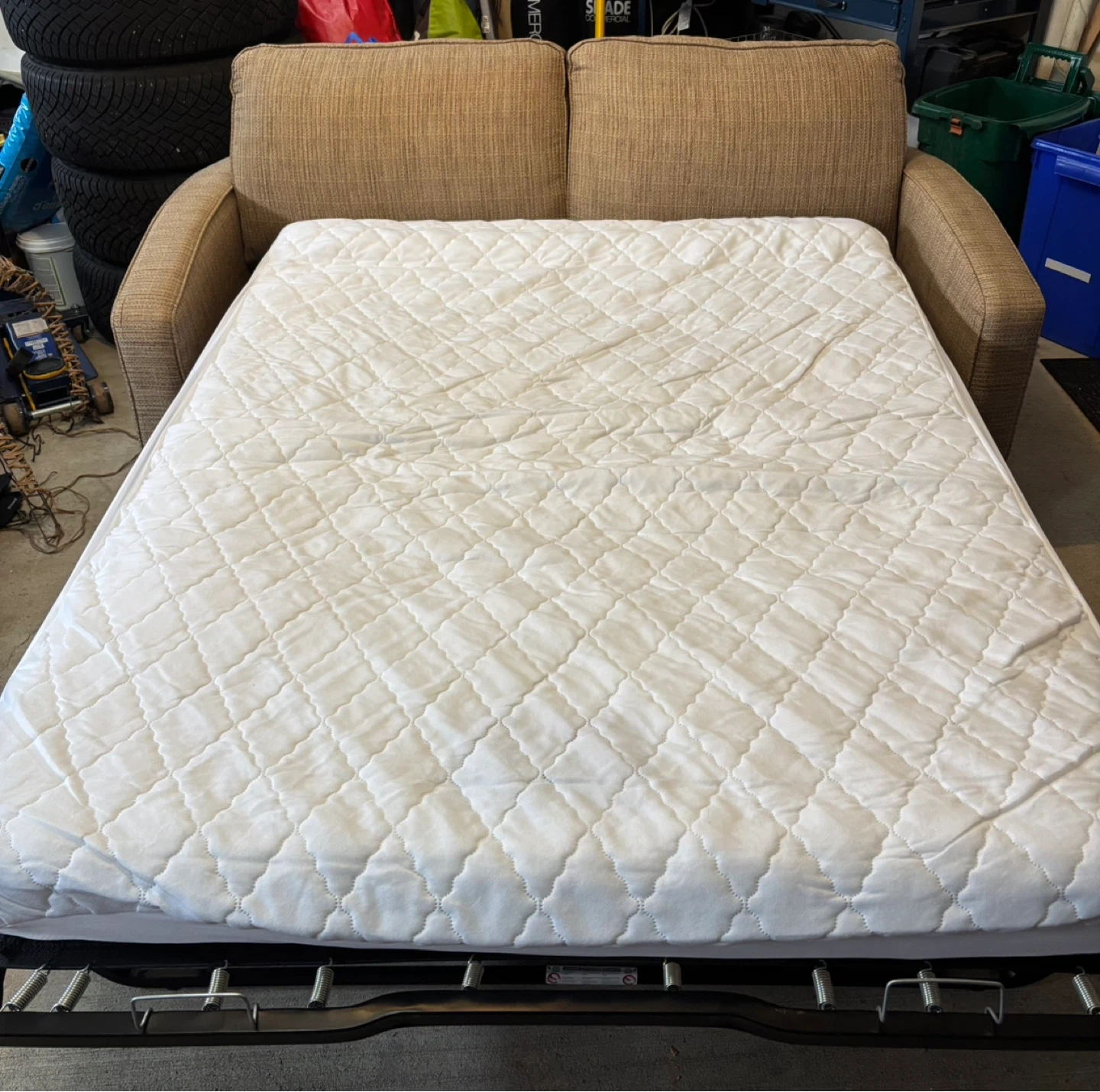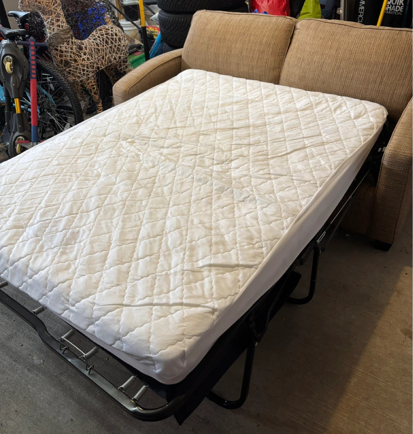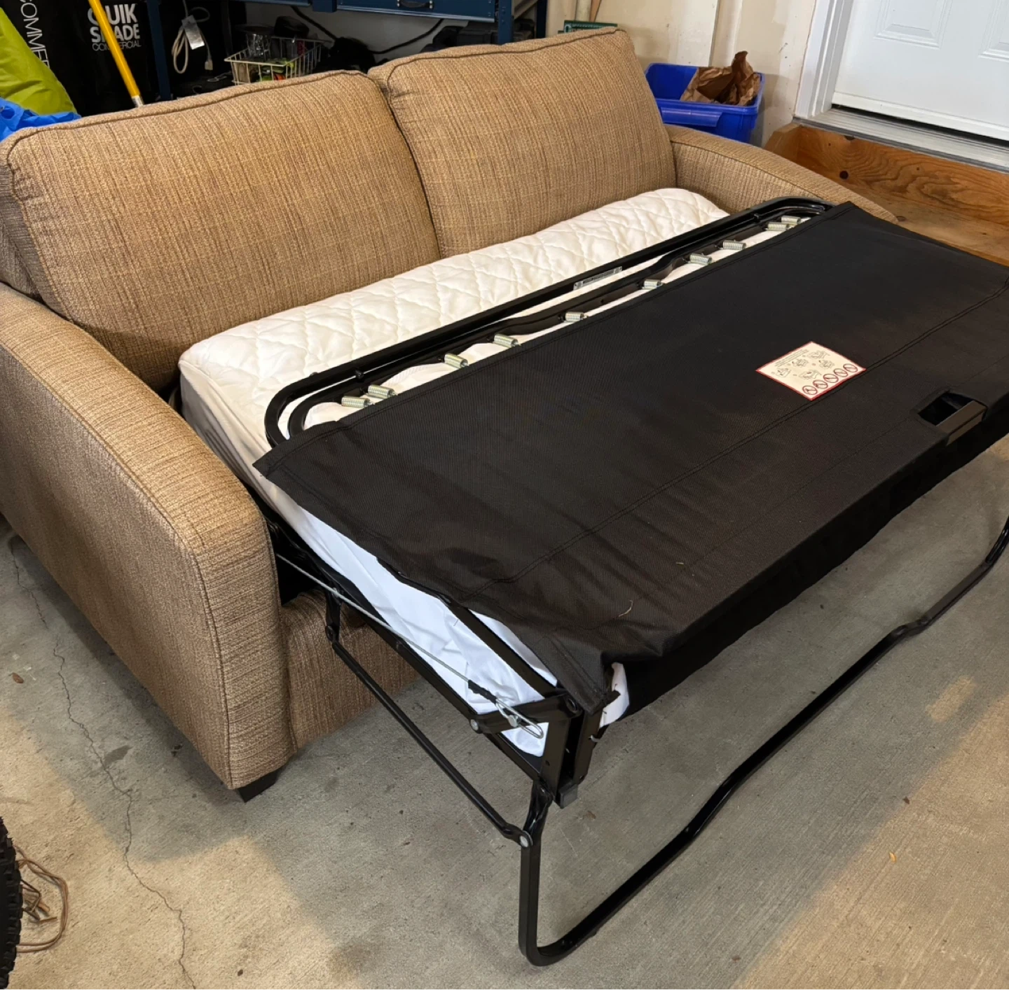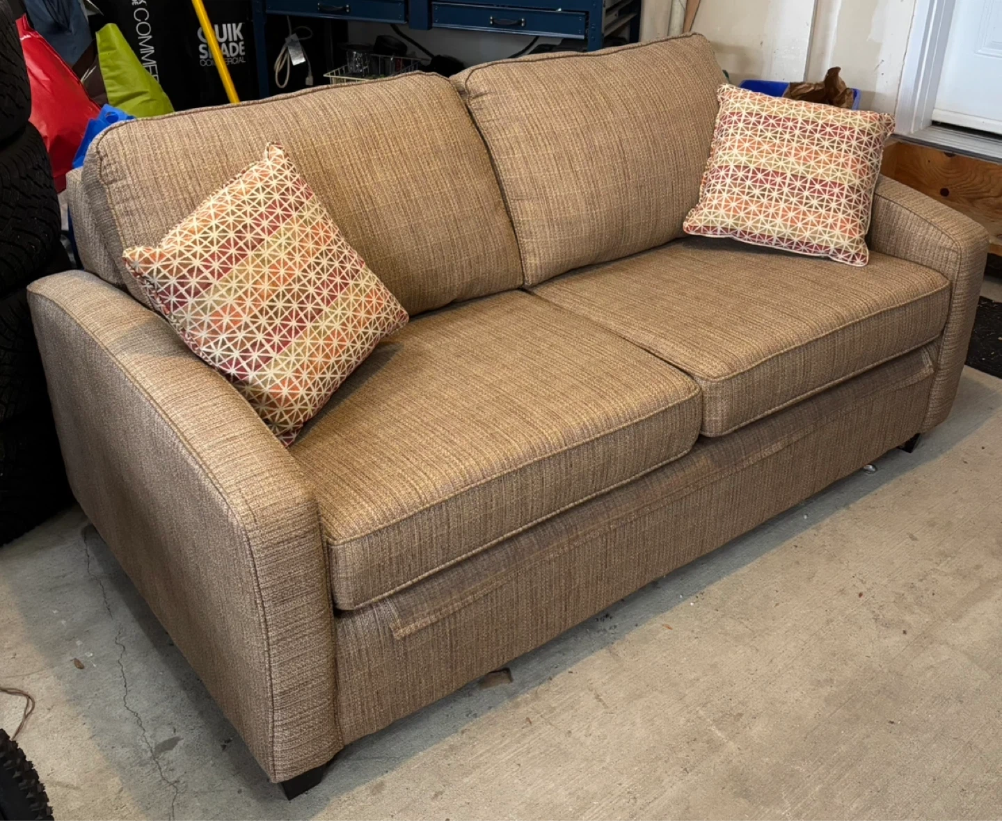 This is a comfortable brown twill custom made sleeper sofa bed. Only slept on twice!