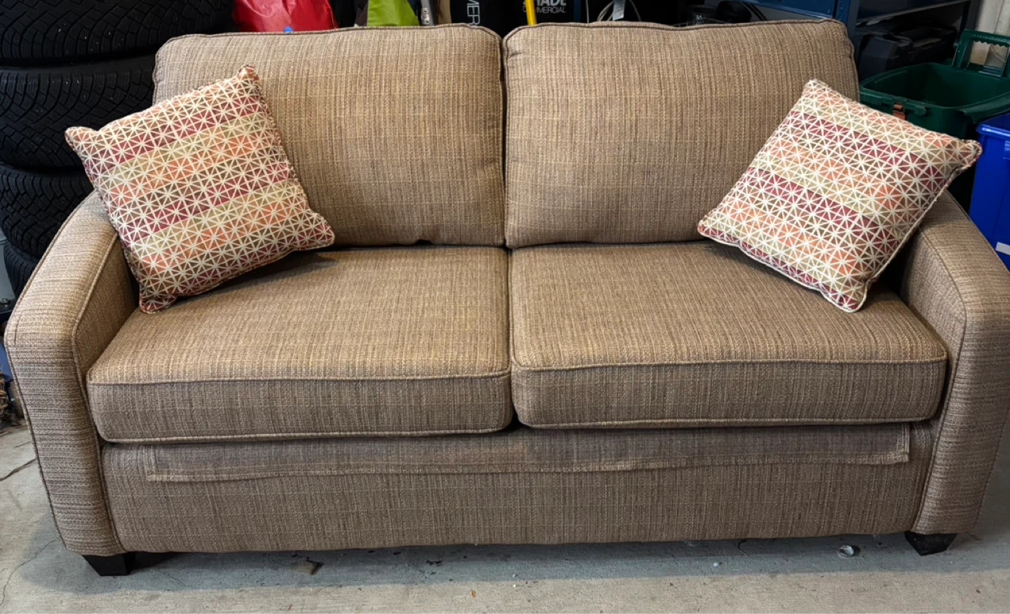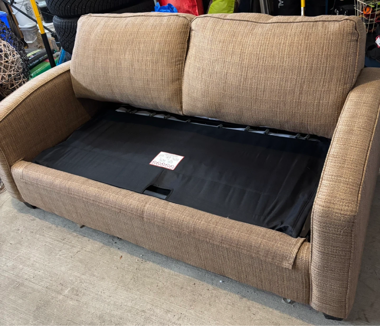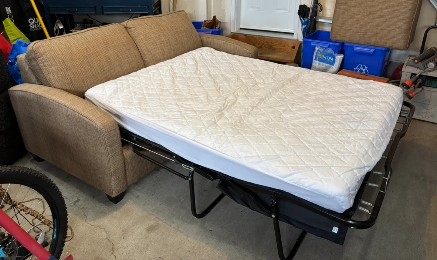 This is a comfortable brown twill custom made sleeper sofa bed. Only slept on twice!