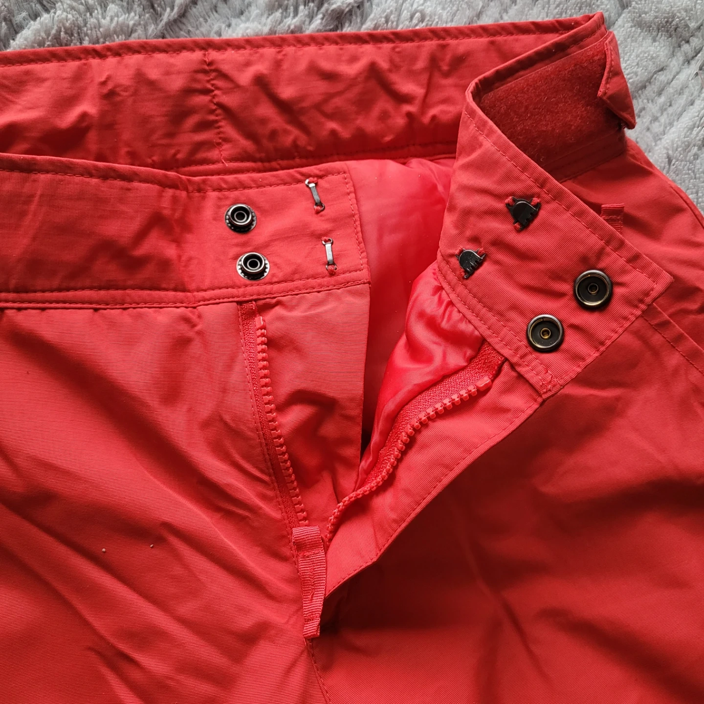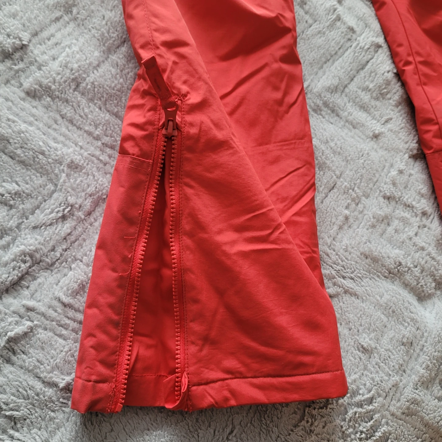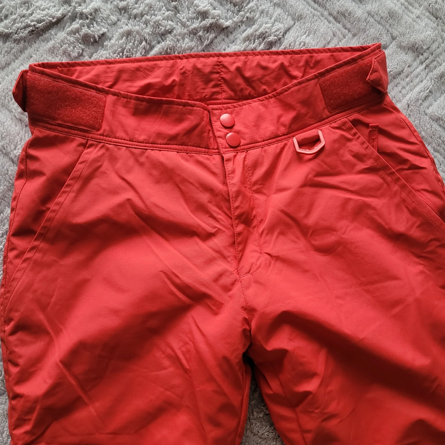 Selling a pair of red women's snow pants. In like-new condition. Has a zipper on the side of each leg, velcro straps on the waist and zippered pockets.