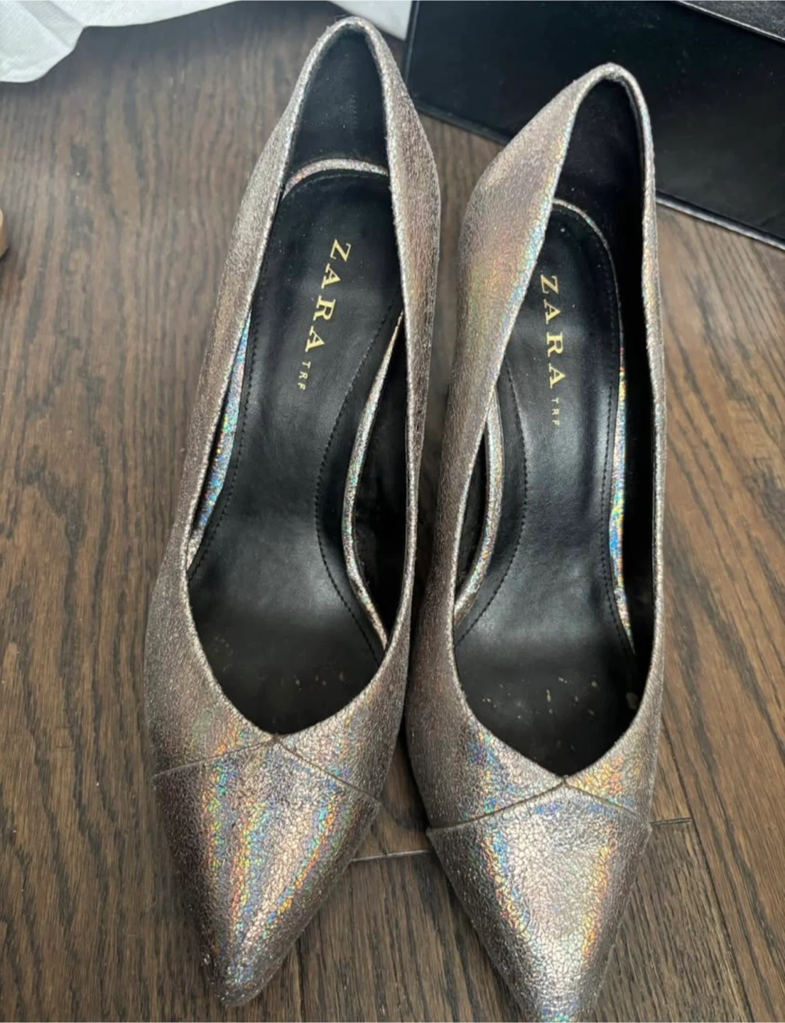 These ZARA TRF heels feature a dazzling silver holographic finish. They have a pointed toe and a comfortable heel height. A great choice for adding a bit of sparkle to any outfit!