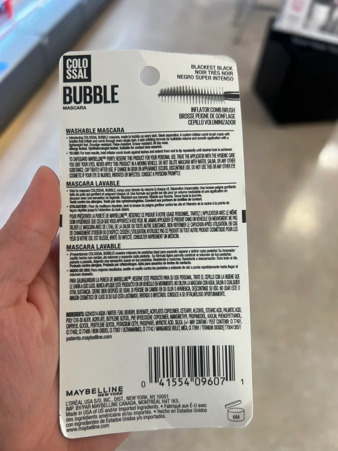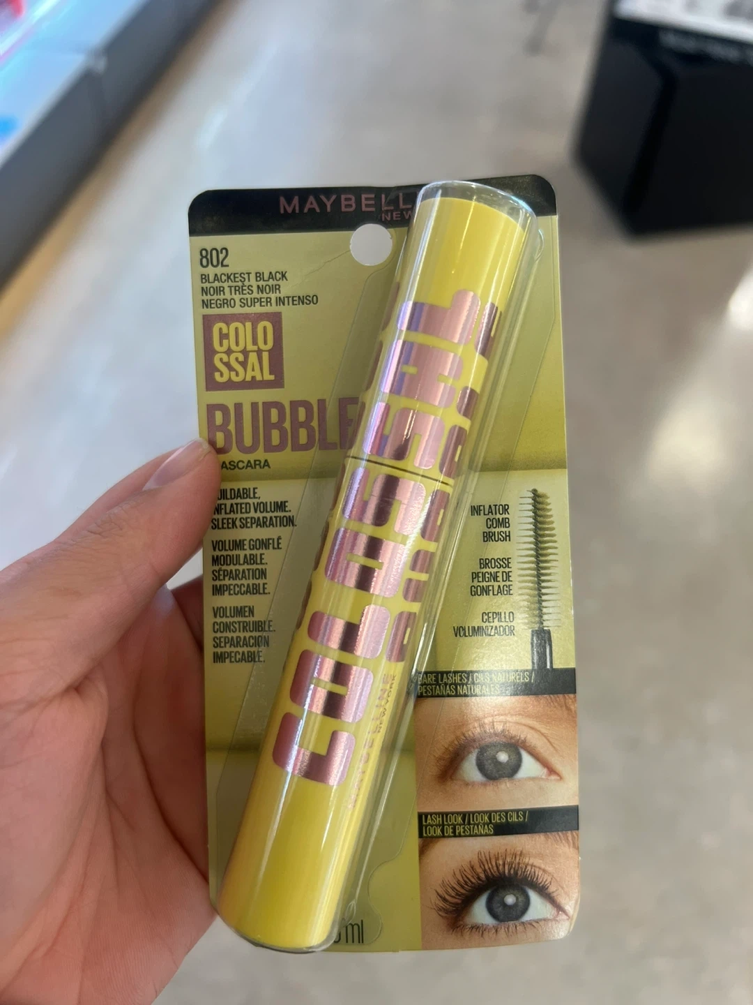 This is a Maybelline Colossal Bubble Mascara in Blackest Black shade. It's designed for buildable, inflated volume with a sleek separation. The formula is washable and features an inflator comb brush for lash-by-lash coverage.