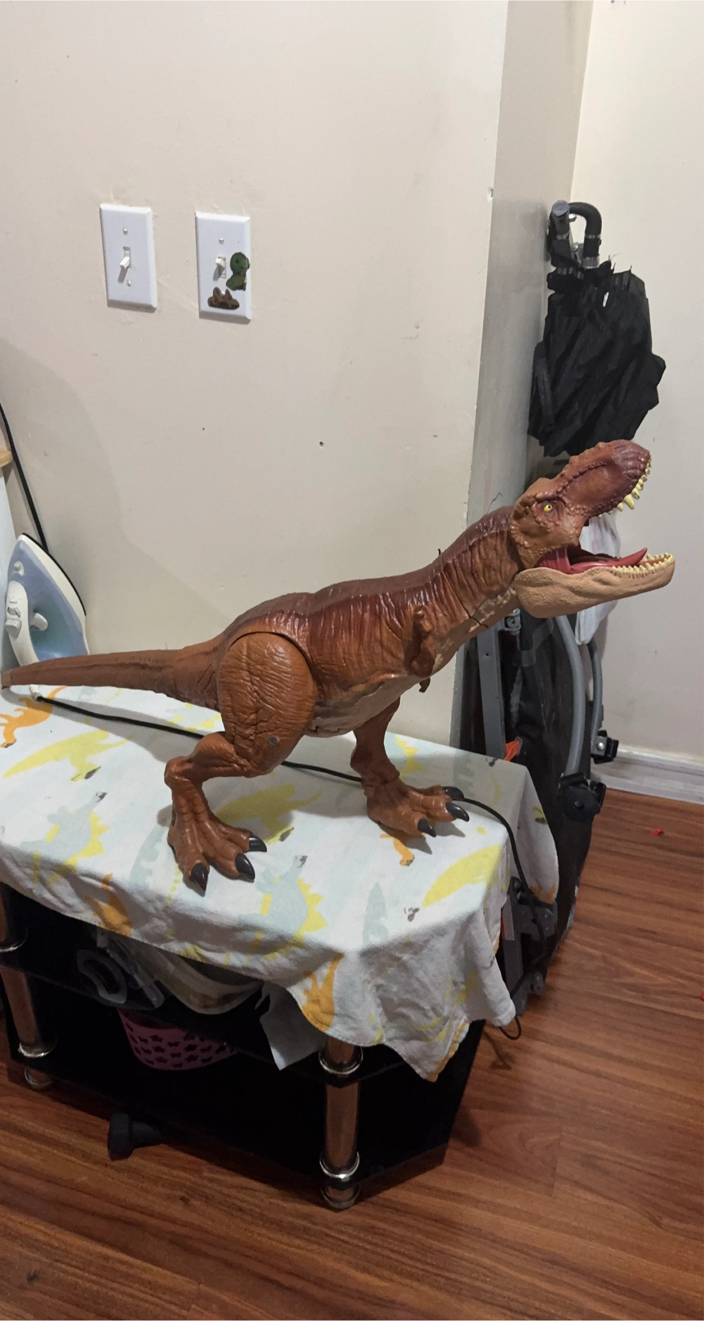 This is a large, brown T-Rex dinosaur toy. It's designed for play and display. Made of durable plastic, it's built to last. Perfect for dinosaur enthusiasts of all ages!