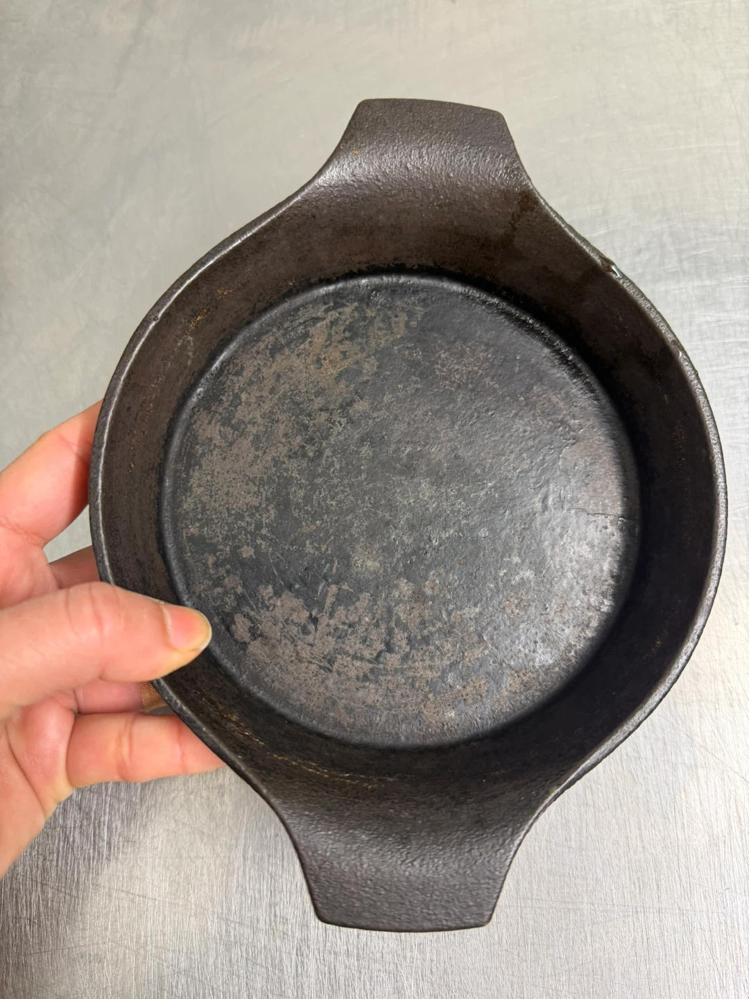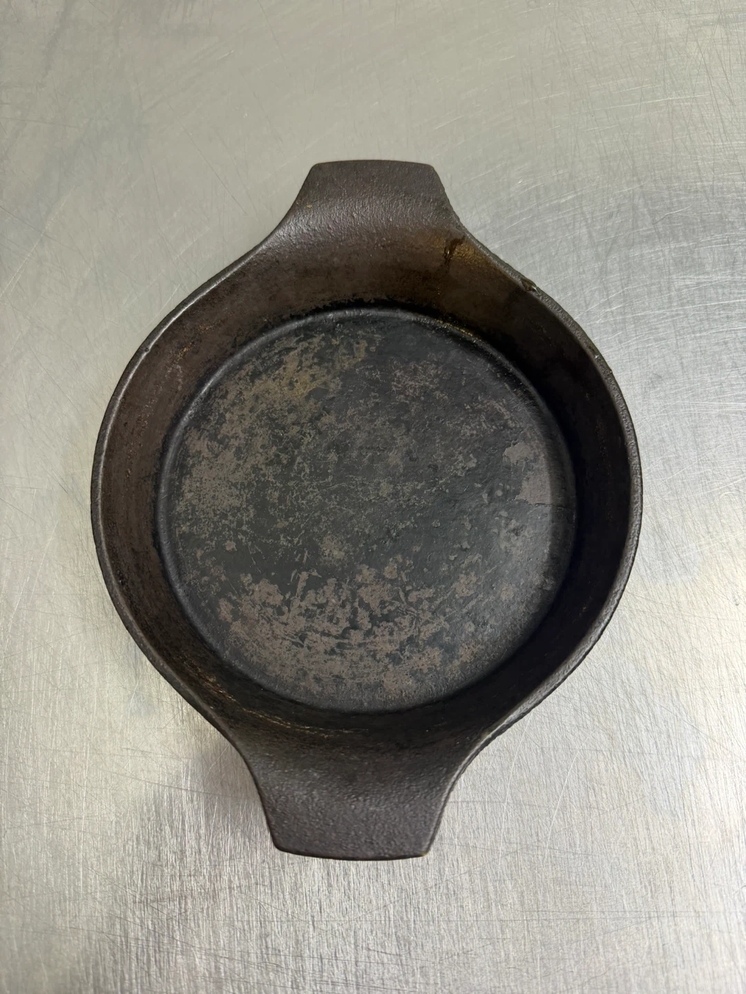 A small cast iron skillet, perfect for single servings or small cooking tasks. It's made from durable cast iron. This pan is great for baking, searing, or frying small portions!