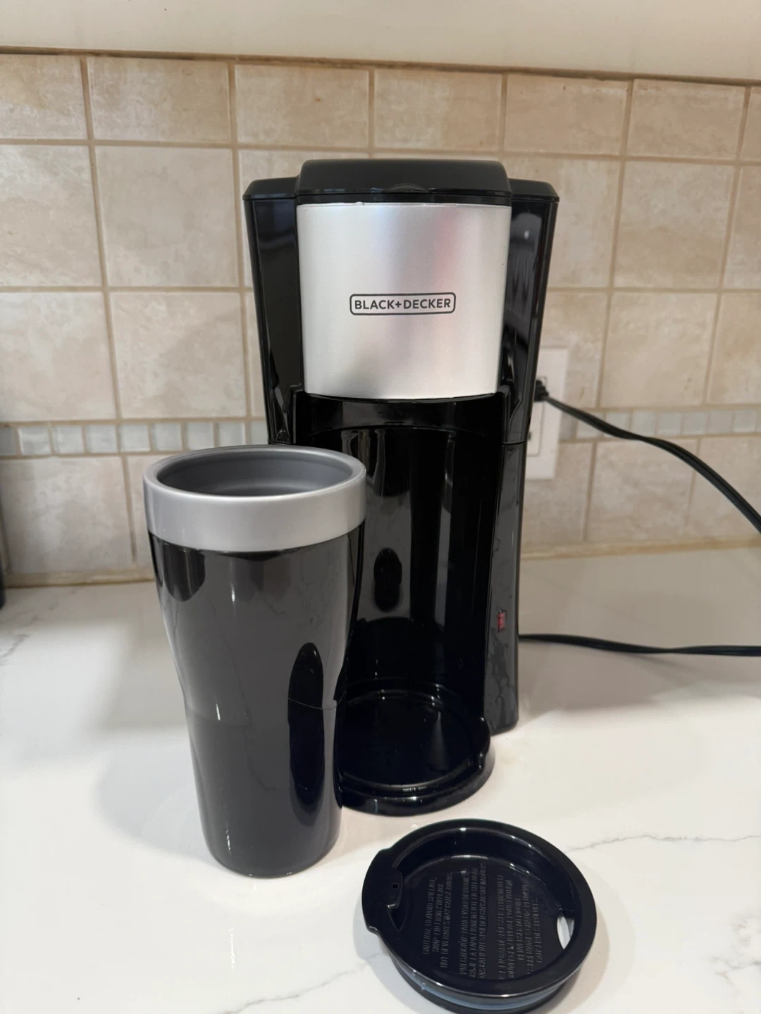 This BLACK+DECKER coffee maker brews single servings. It comes with a black travel mug and a lid. Perfect for on-the-go coffee needs!