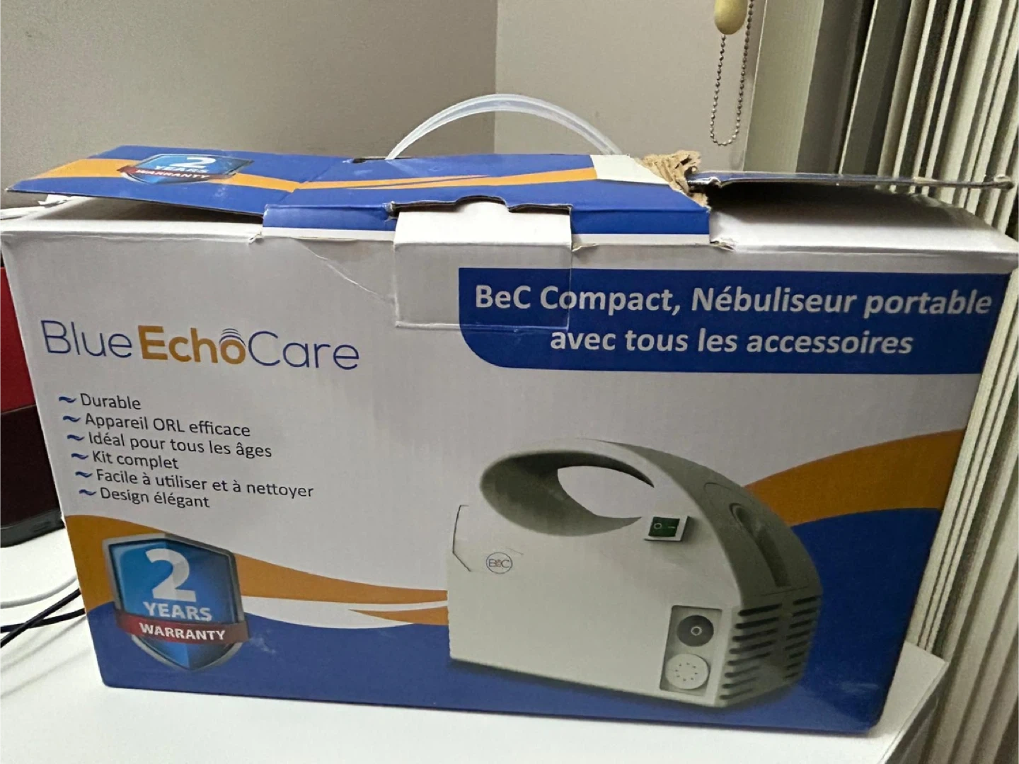 This is the Blue EchoCare BeC Compact nebulizer. It's durable and comes with all accessories. It's easy to use and clean, with an elegant design. This portable nebulizer is ideal for all ages and includes a 2-year warranty.