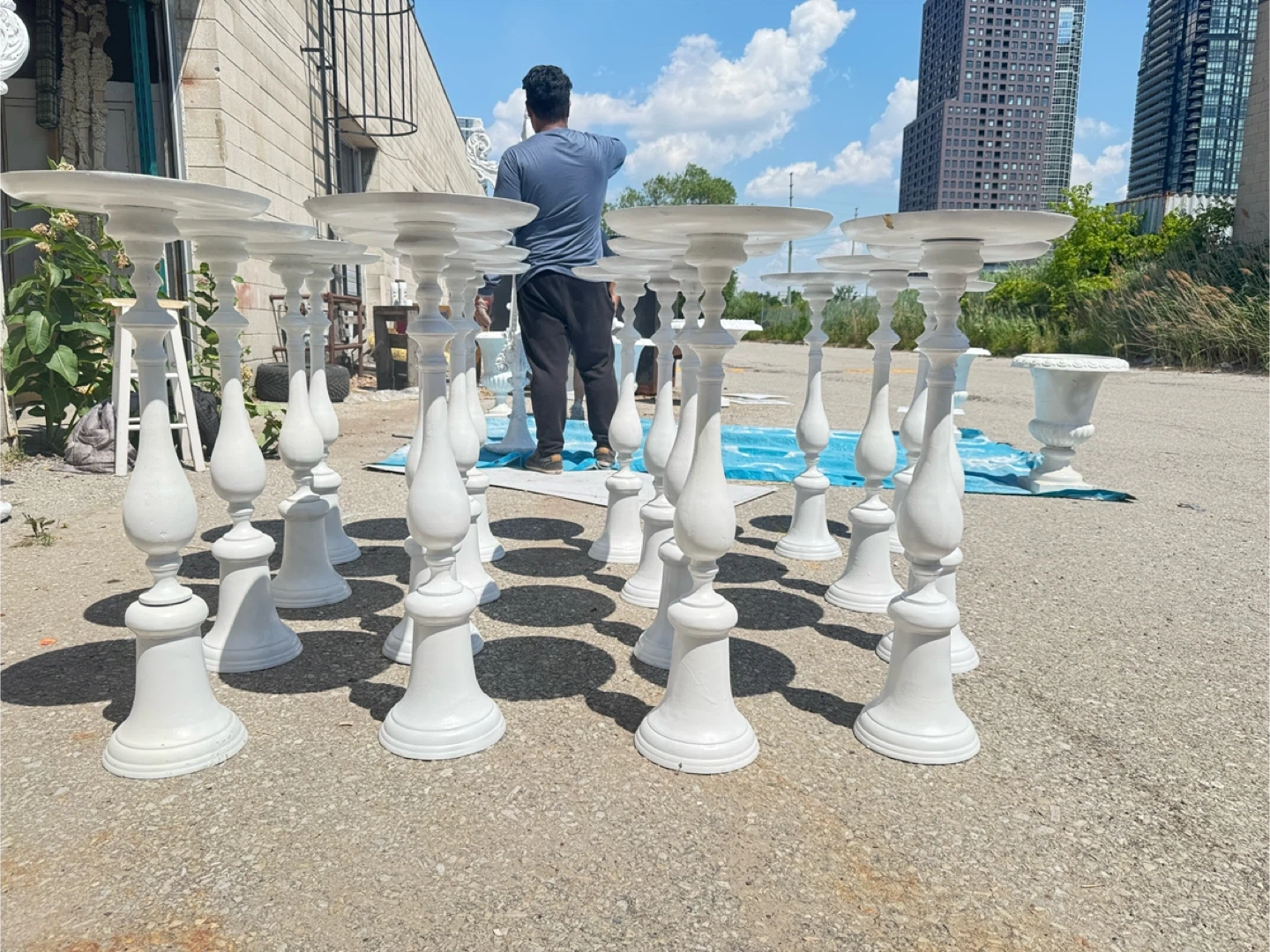 Set of thirteen white pedestal stands. These have a classic, decorative design. They're great for events or display.