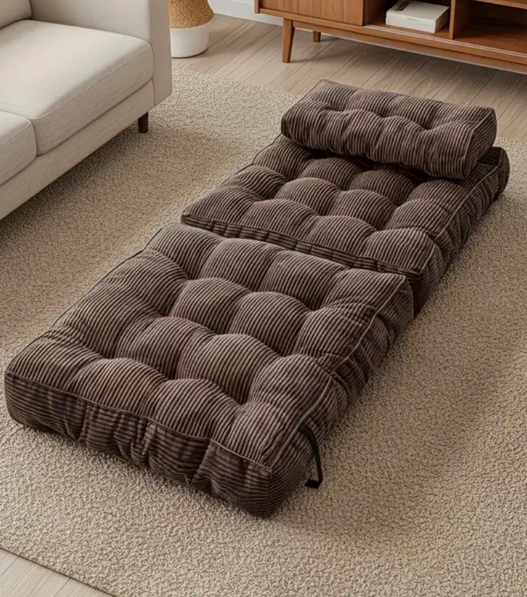 Floor sofa bed is upholstered in soft brown corduroy fabric. Comfy cozy for lounging or sleeping.