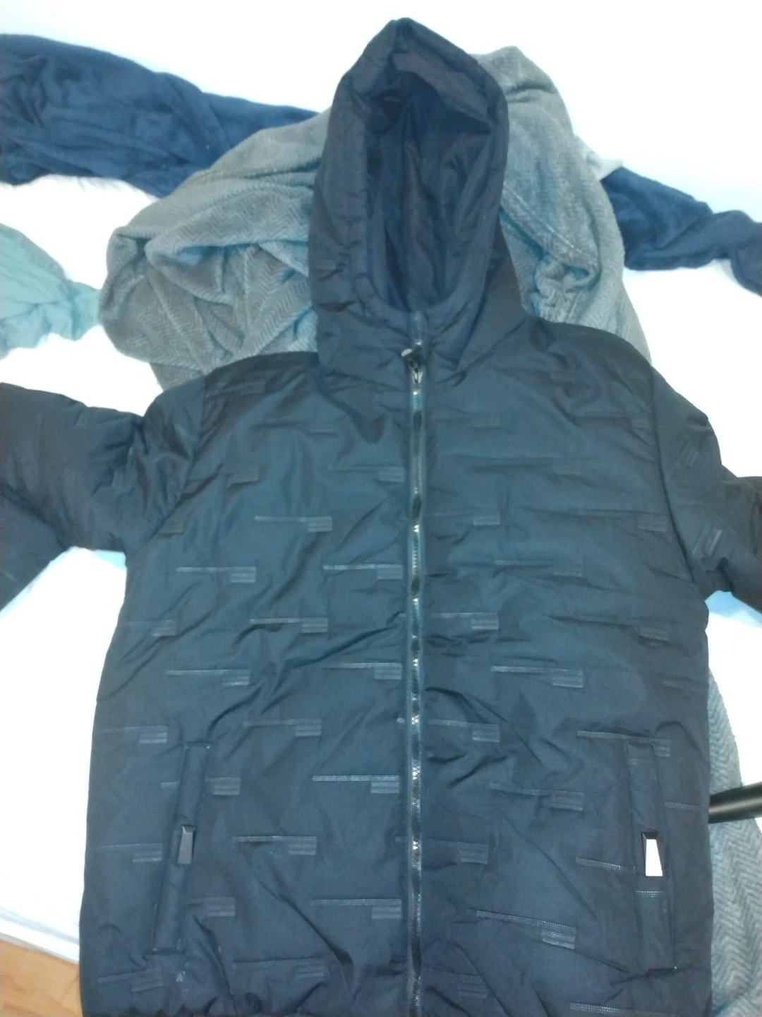 This is a black puffer jacket with a hood, perfect for staying warm during the colder months. It features a zipper closure and a stylish design. It's in great condition and ready for a new owner!