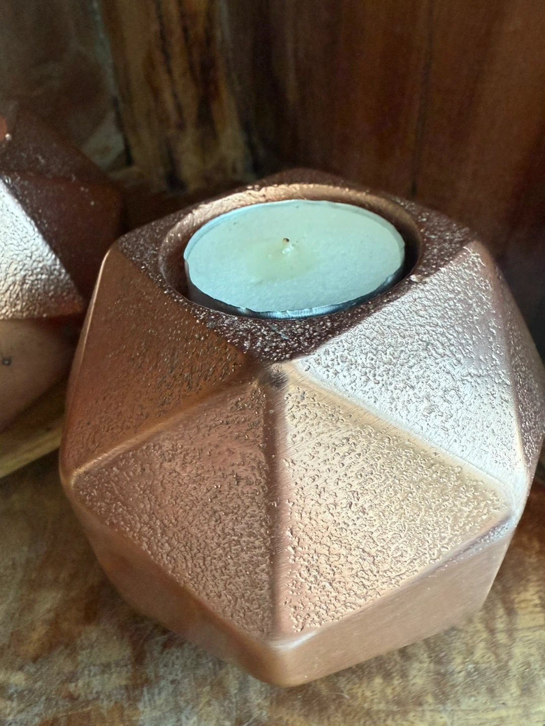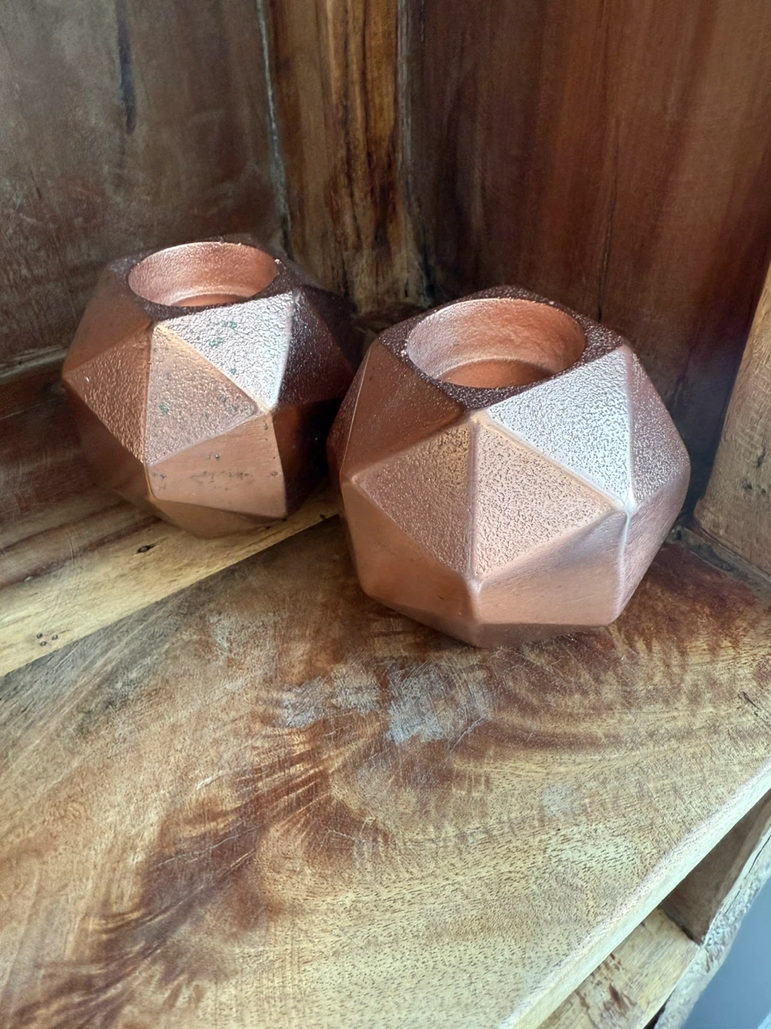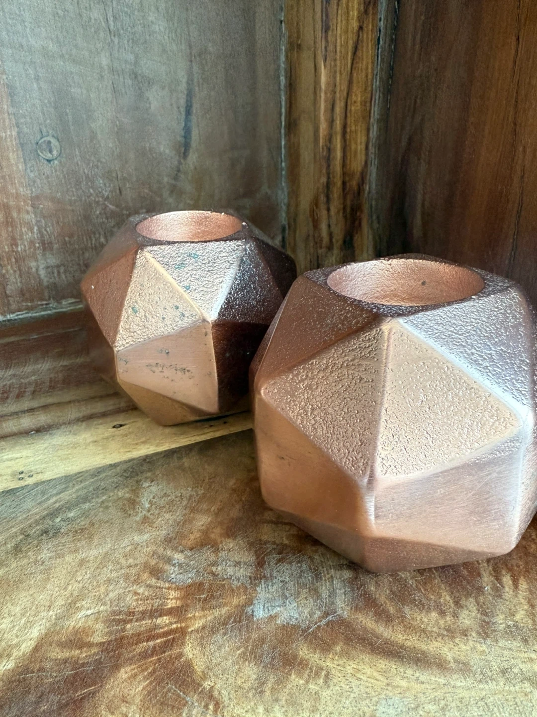 Two geometric candle holders, rarely used. Some areas with paint “worn out” which are inherent to the design. Purchased from Artemano.