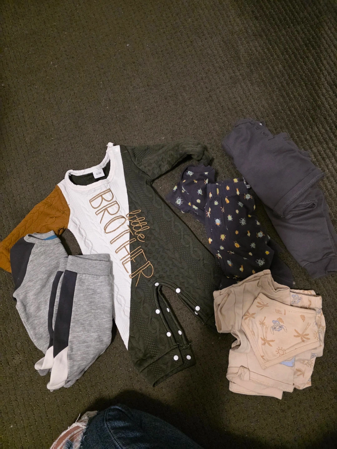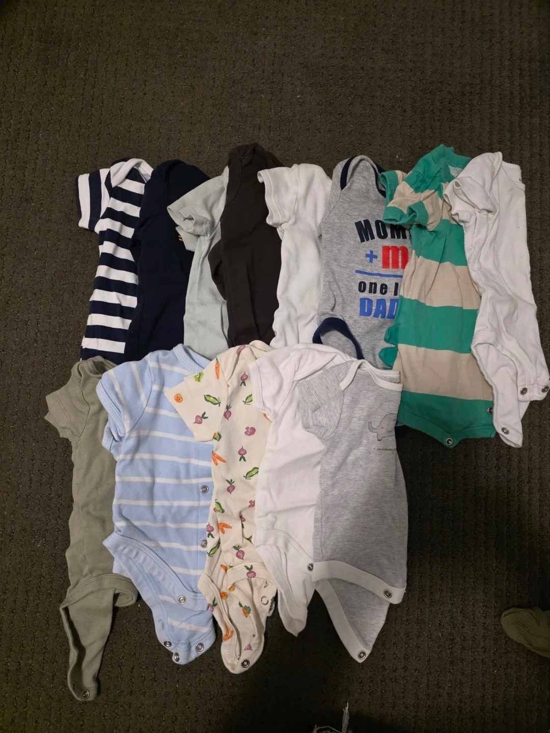 A mixed bundle of baby clothes including sleepers, undershirts, pants, a swimsuit, and outfits. It also comes with sleepsacks and receiving blankets, plus a cute crab-print hat. Perfect for outfitting your little one with a variety of essentials!