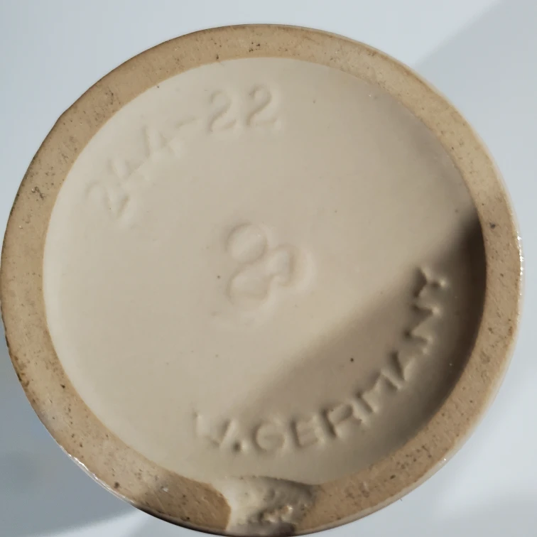Selling a vintage ceramic vase made in West Germany. It features a beautiful design with cream, blue, and brown stripes. Mid century 1970