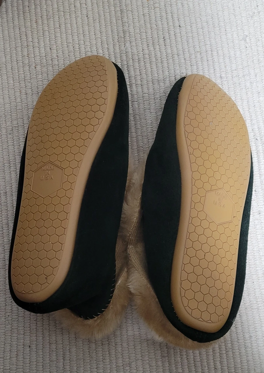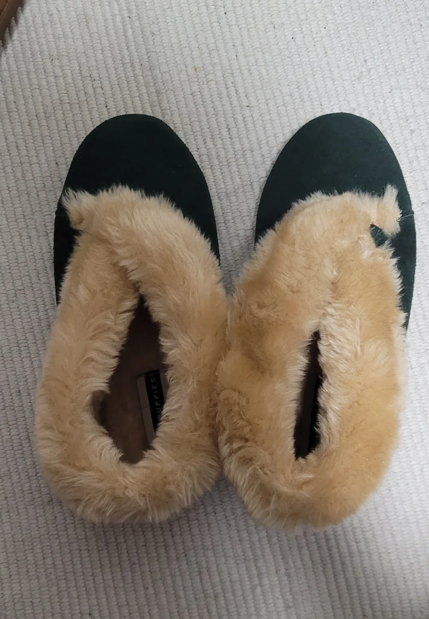 Cozy Hush Puppies slippers in a dark green suede! They're a size 5 and in great condition. Perfect for keeping your feet warm on chilly days