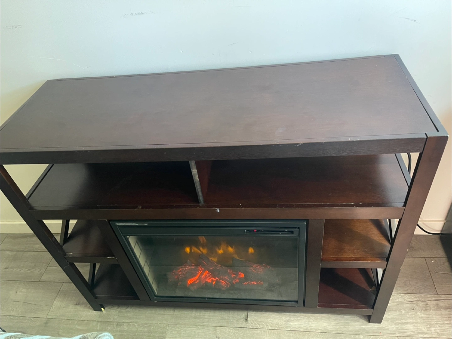 Selling a dark brown TV stand that comes with a built-in electric fireplace. It's a great way to add some warmth and ambiance to your living room while also providing storage and a place for your TV. It's in good condition and ready for a new home!