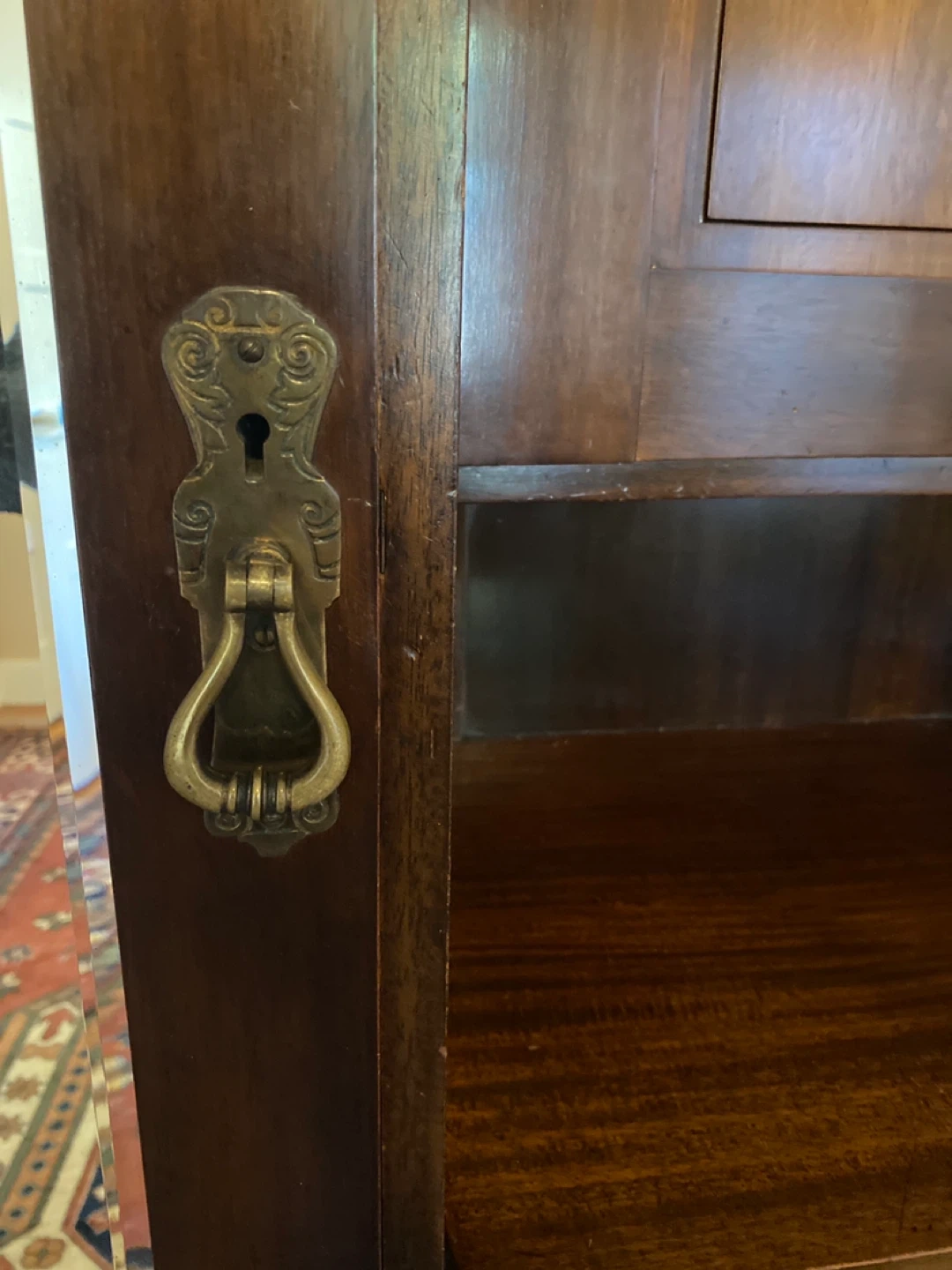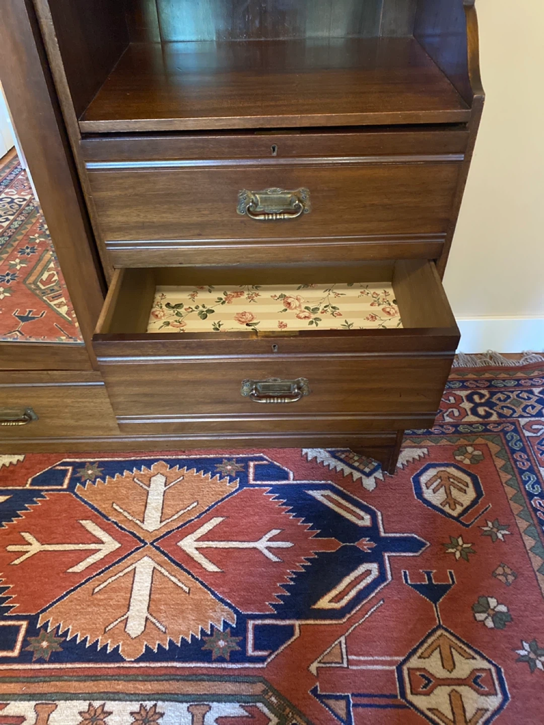 A beautiful vintage wooden armoire featuring a full-length mirror and ample storage. It has hanging space inside the cabinet section and three drawers below for organization. This piece would be great for storing clothing or linens.