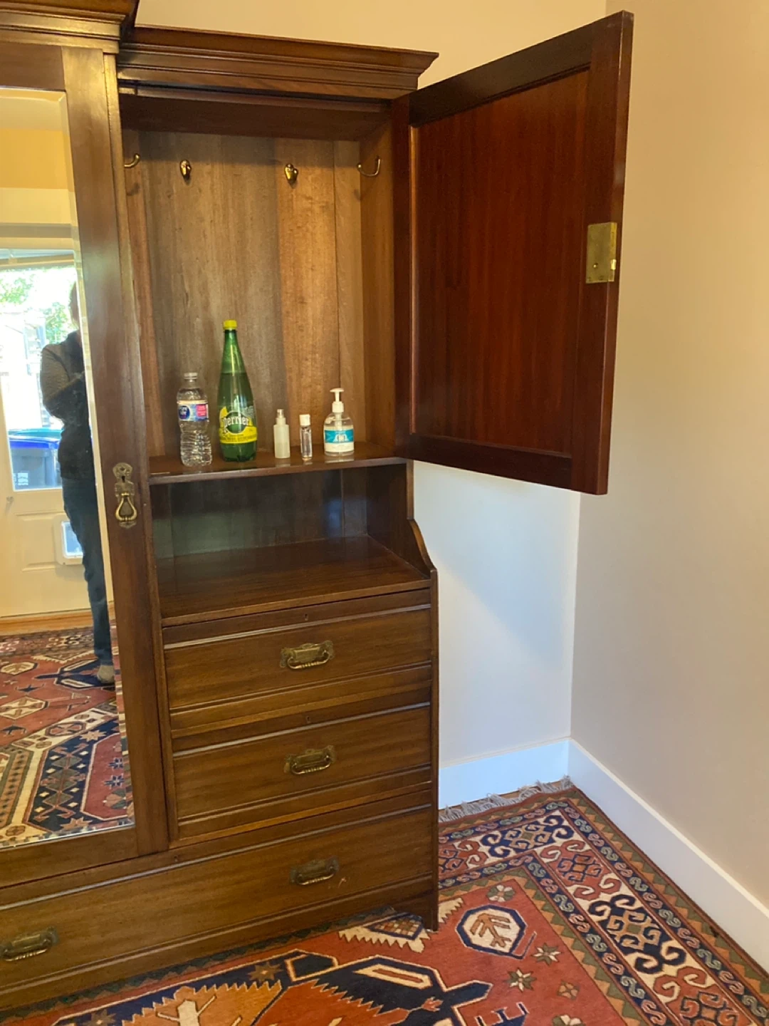 A beautiful vintage wooden armoire featuring a full-length mirror and ample storage. It has hanging space inside the cabinet section and three drawers below for organization. This piece would be great for storing clothing or linens.