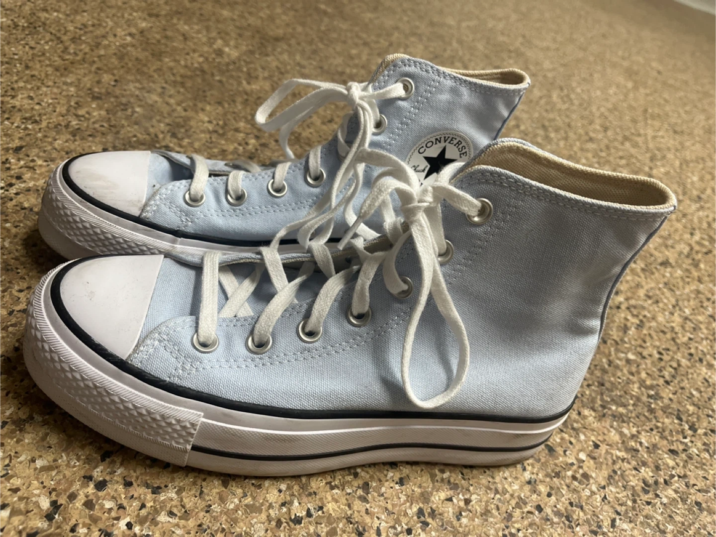 Classic light blue Converse All Star high-top sneakers. Canvas upper with white laces and rubber toe cap. These kicks are perfect for everyday wear!