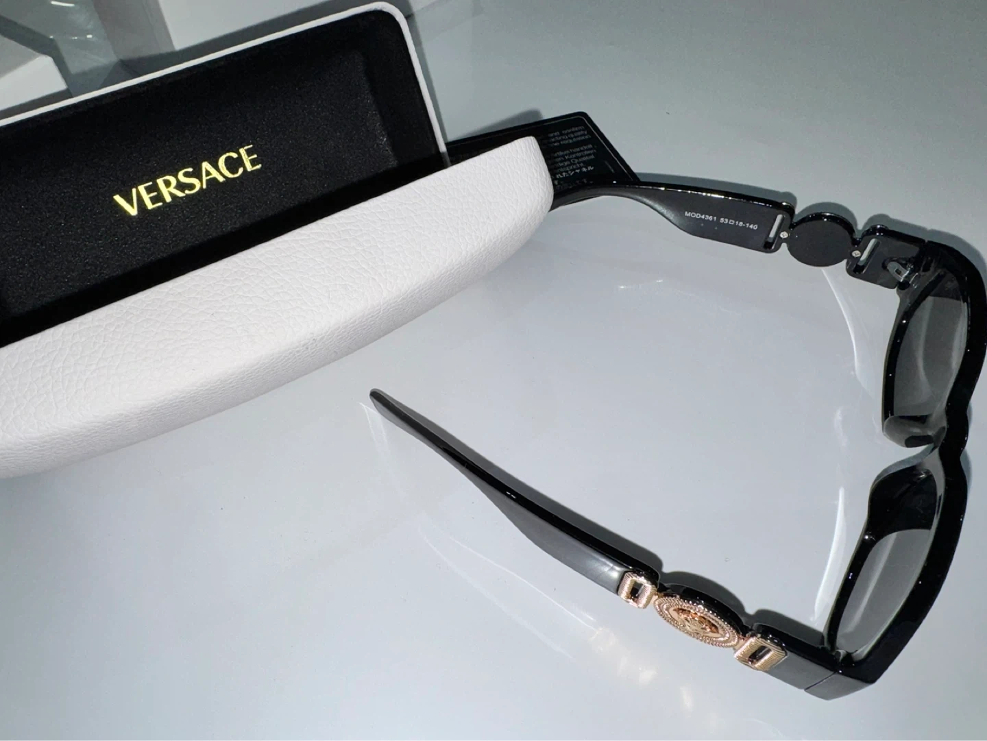 Versace black sunglasses with gold accents. Includes original case and box. Model number MOD4361 B3218-140.