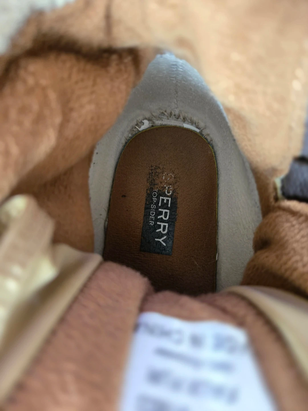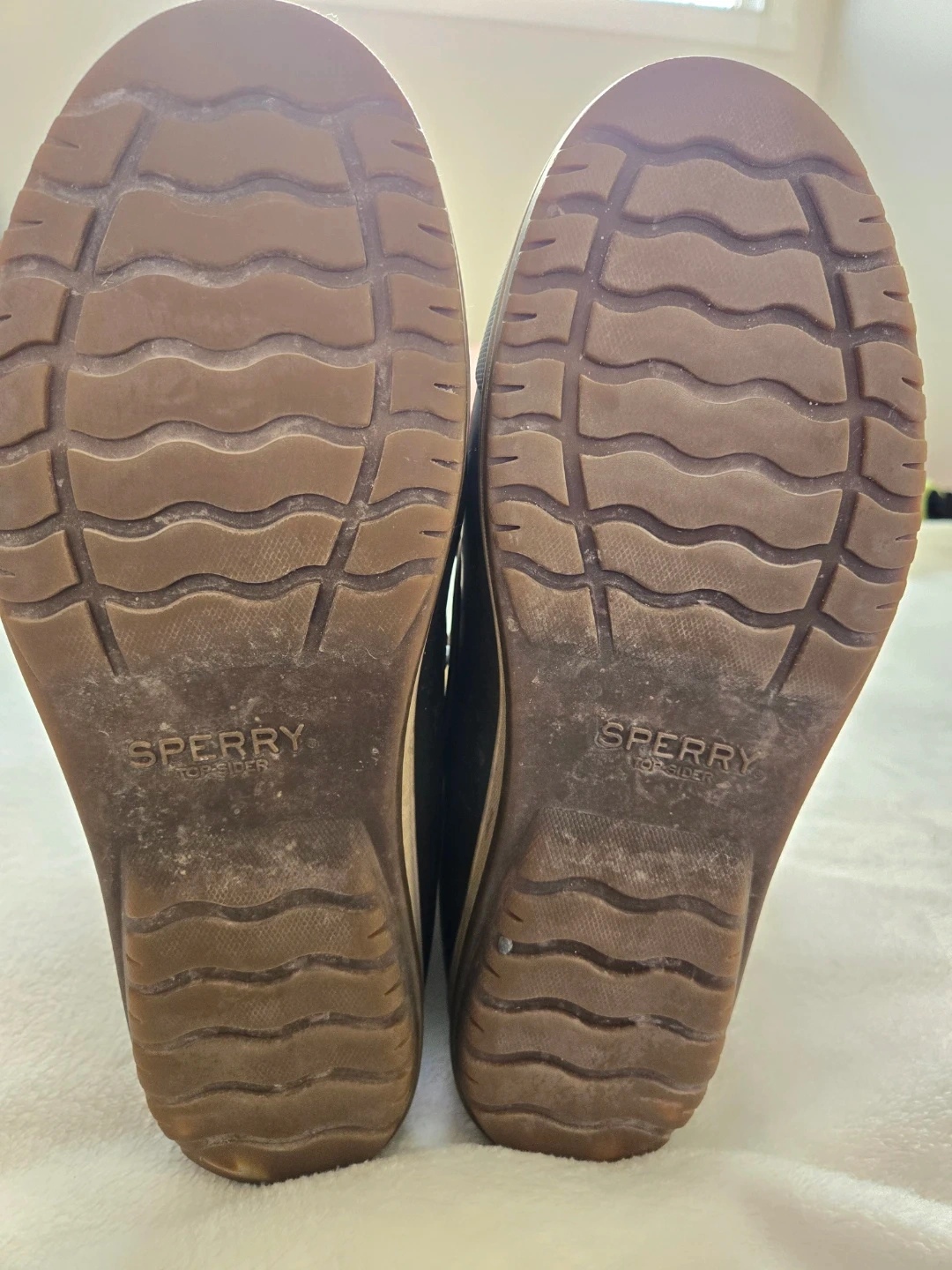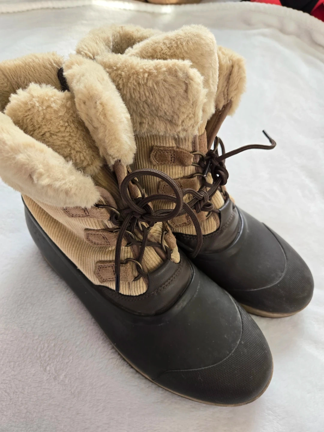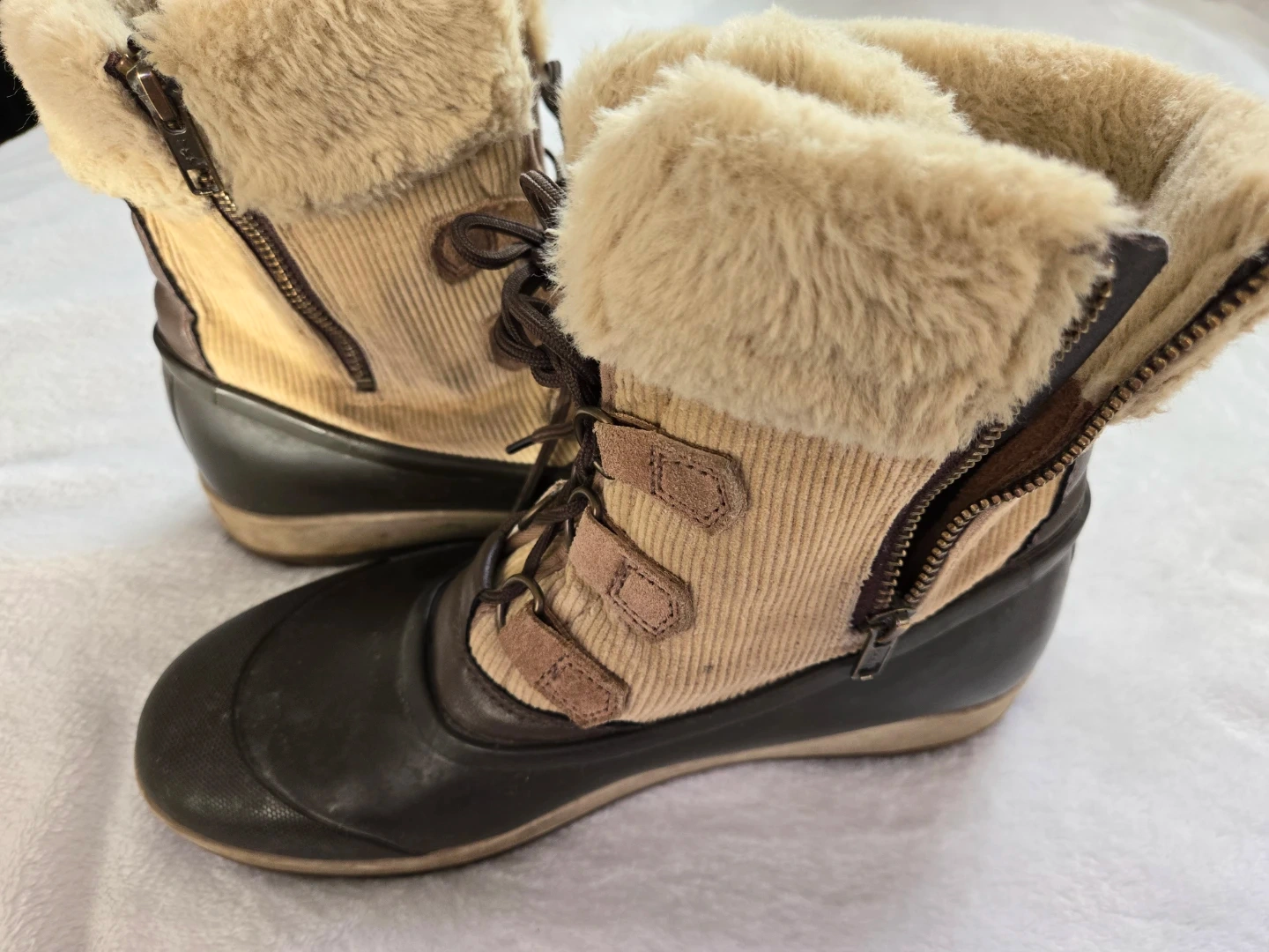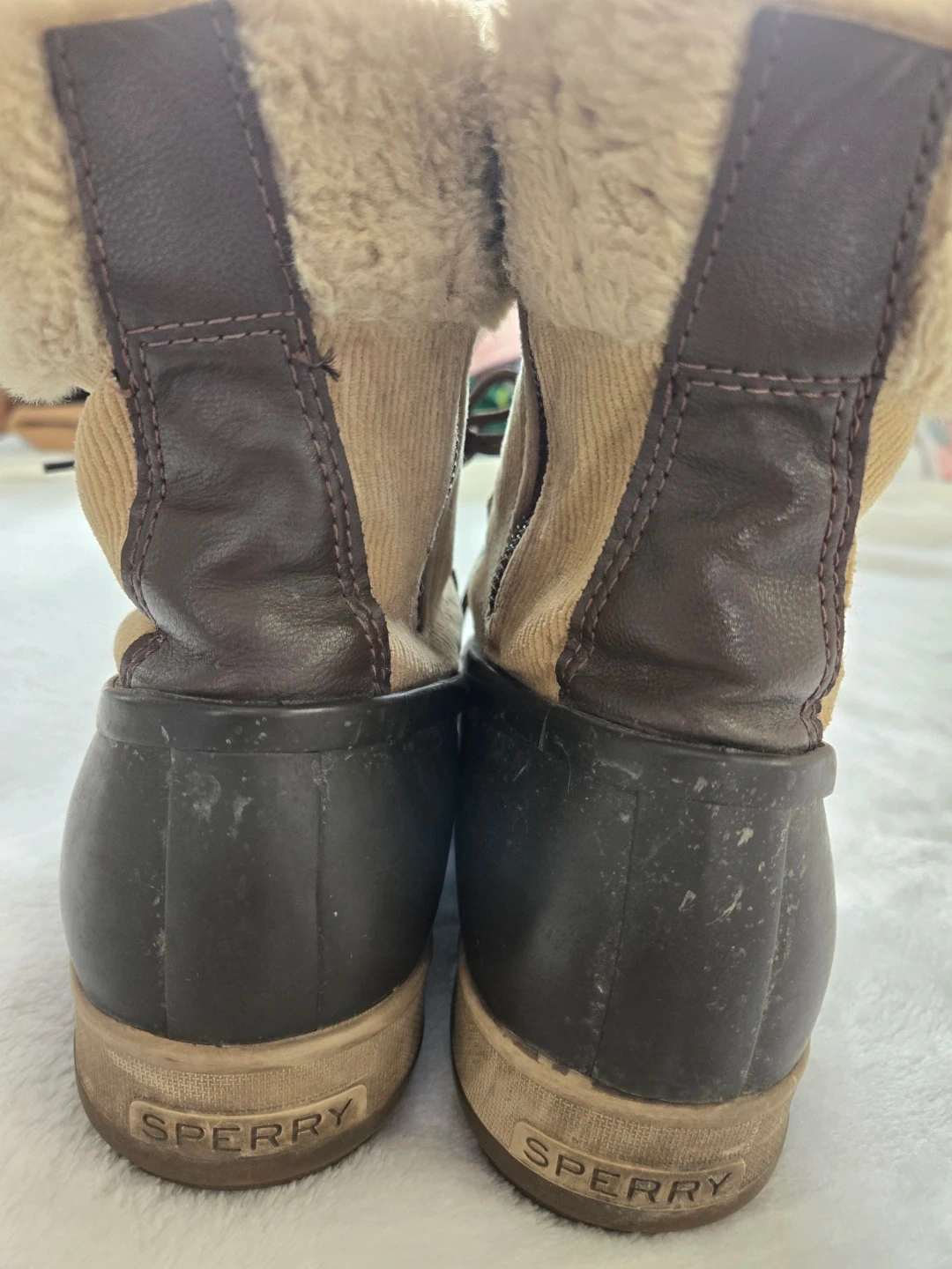 Cozy Sperry Top-Sider boots for women, perfect for fall and winter! These boots are a size 10 and feature a cute corduroy design with faux fur trim and a zipper. They have some signs of wear, but are still in good condition for keeping your feet warm and dry!