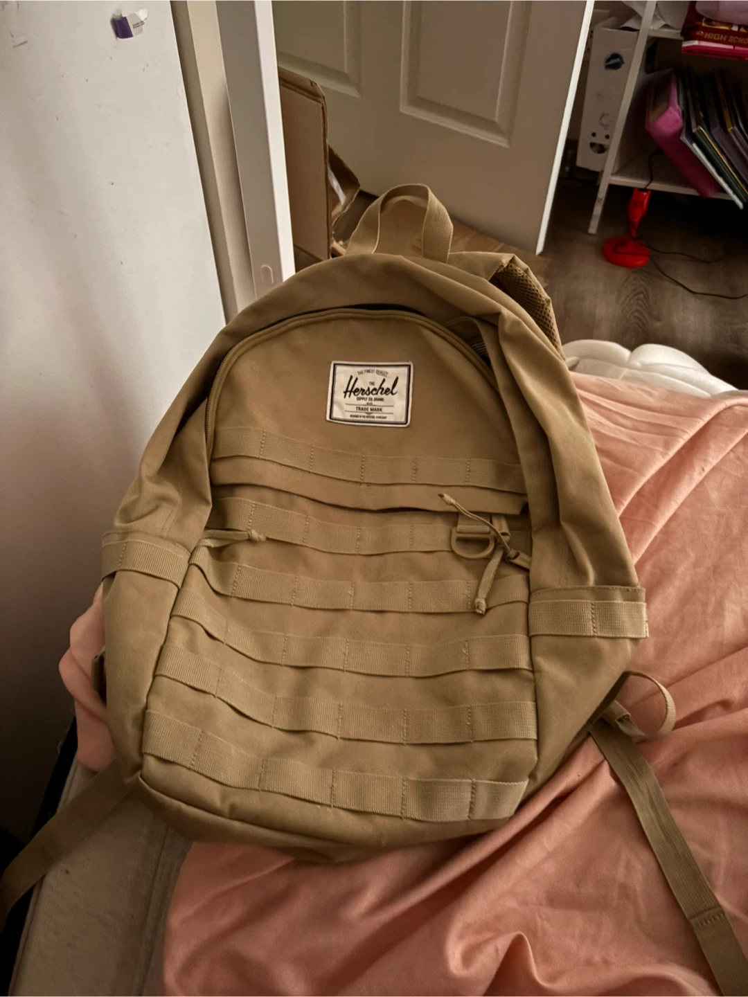 Herschel Supply Co. backpack in a tan colour. It has multiple straps on the front for customization. This backpack is useful for carrying daily essentials.