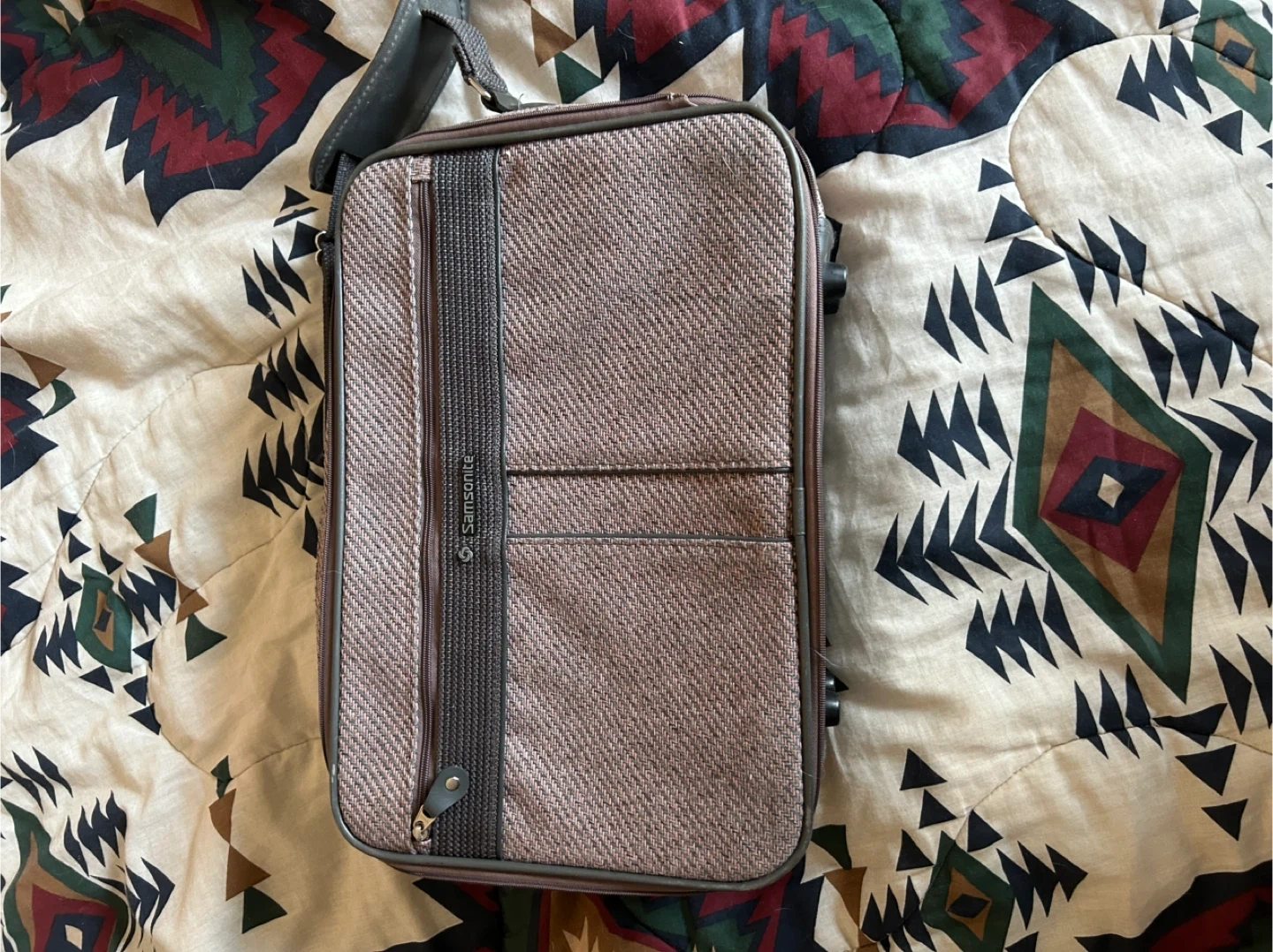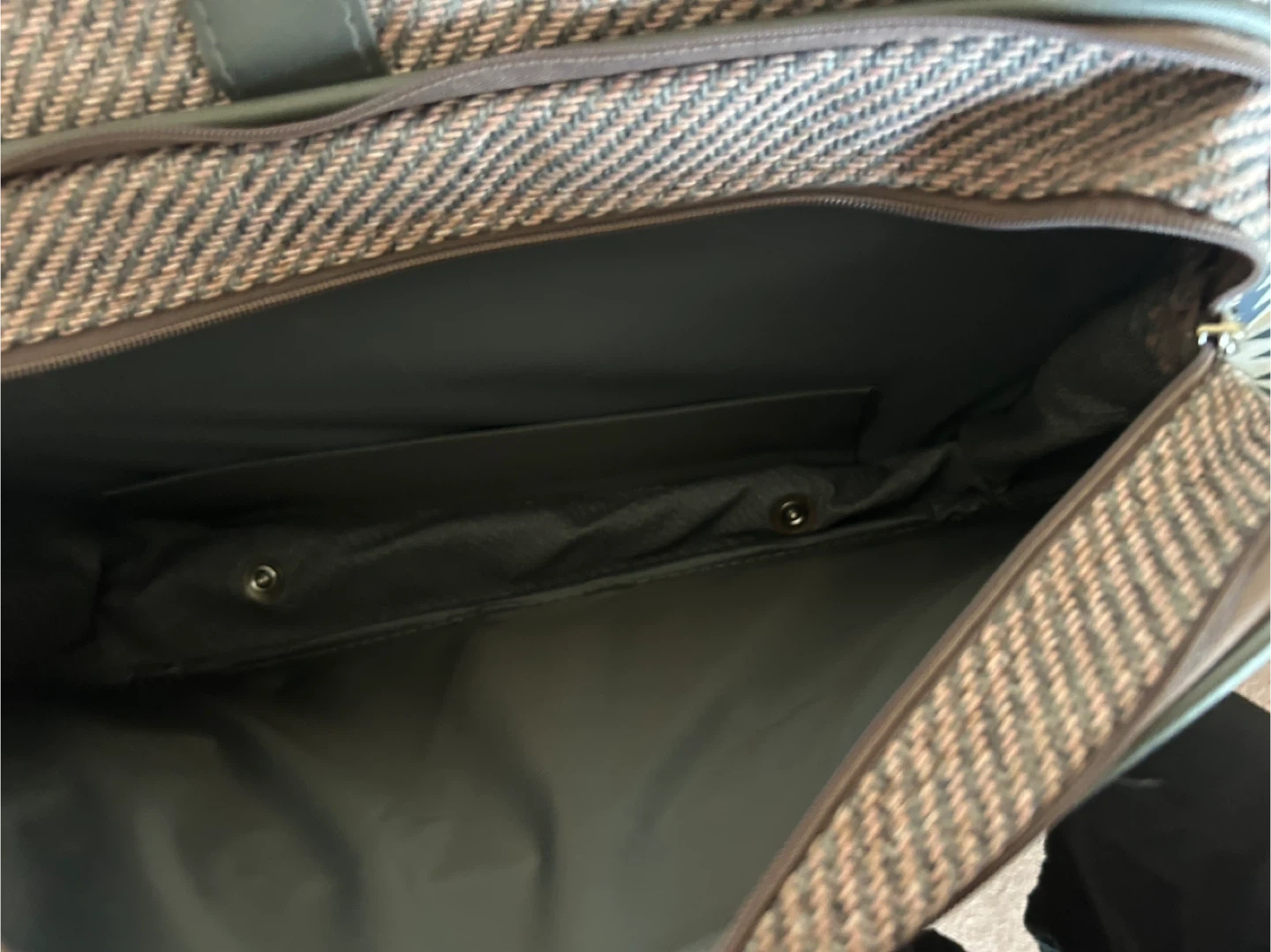 Selling a Samsonite shoulder bag in good condition. It has a tweed-like exterior and a spacious interior with multiple compartments. Perfect for travel or everyday use!