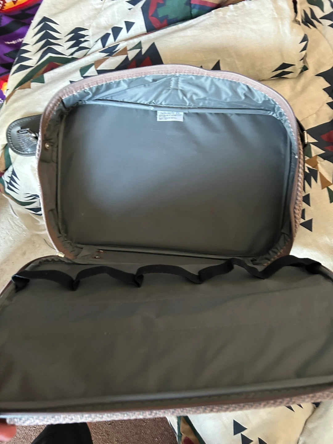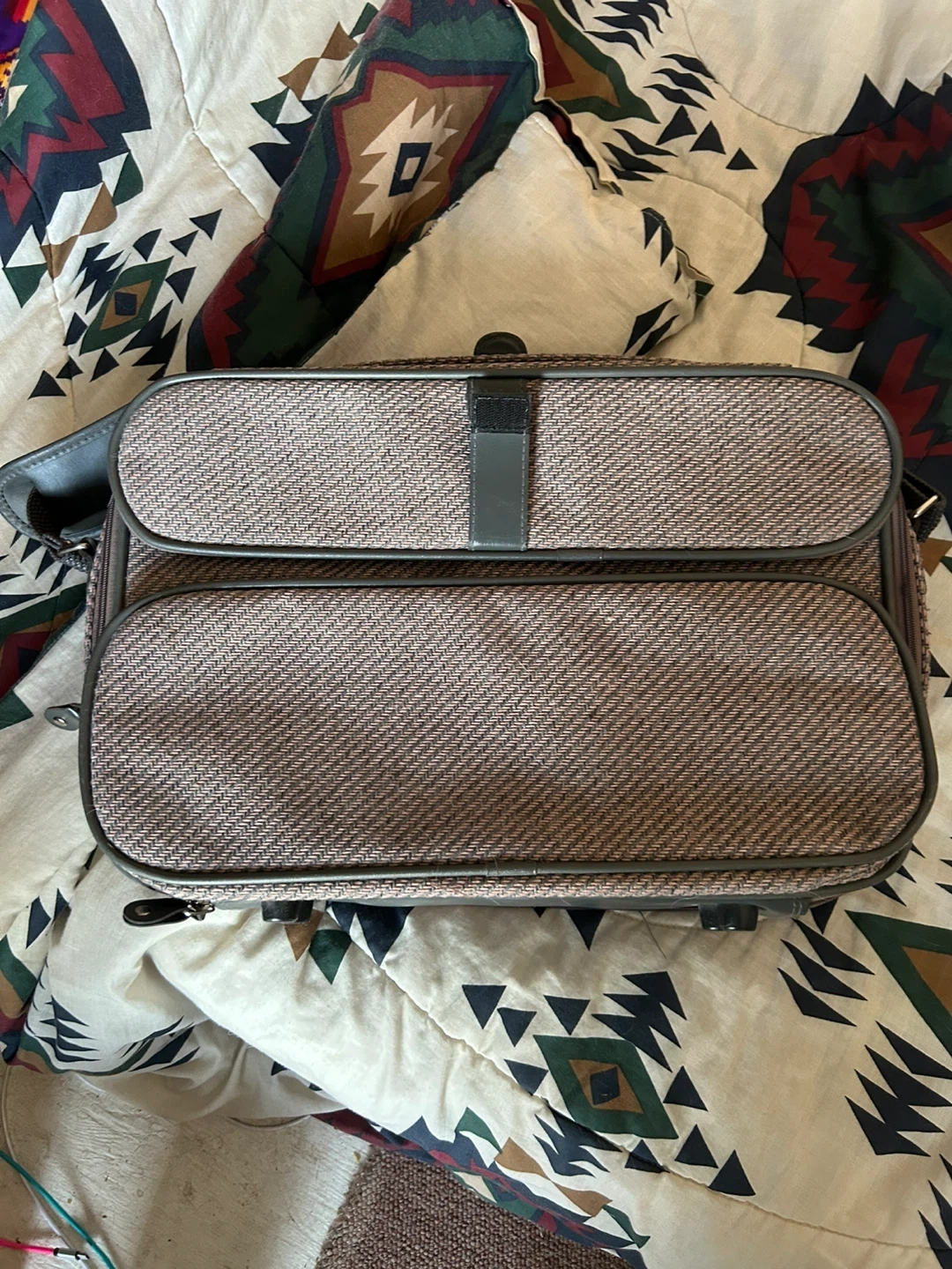 Selling a Samsonite shoulder bag in good condition. It has a tweed-like exterior and a spacious interior with multiple compartments. Perfect for travel or everyday use!