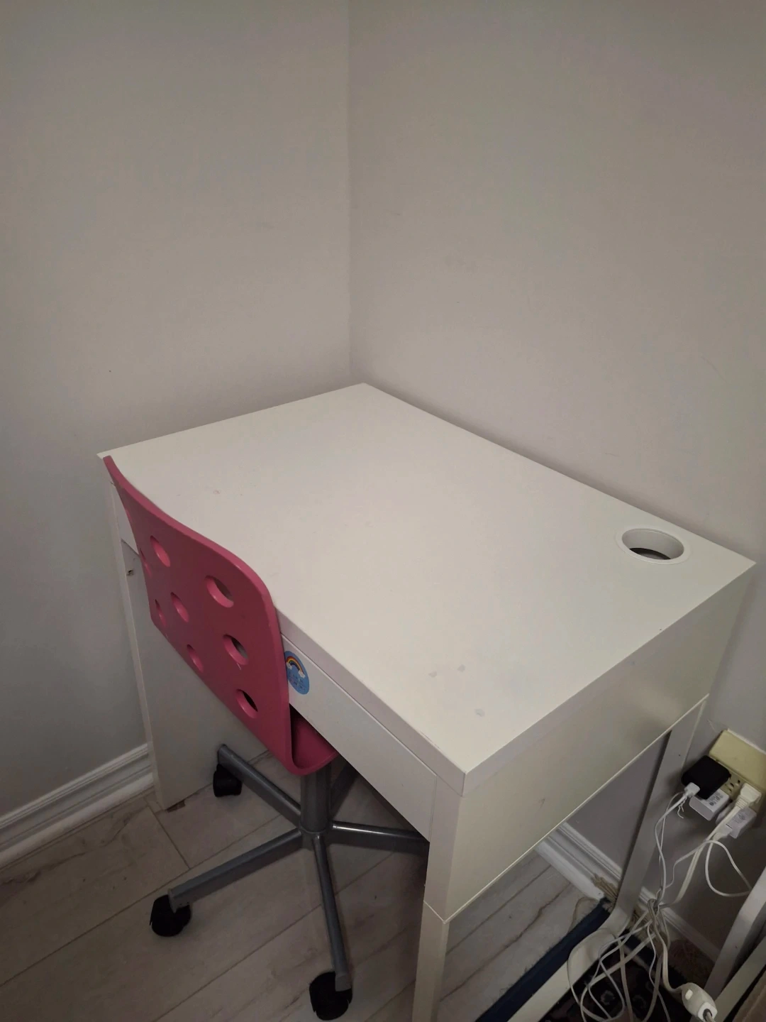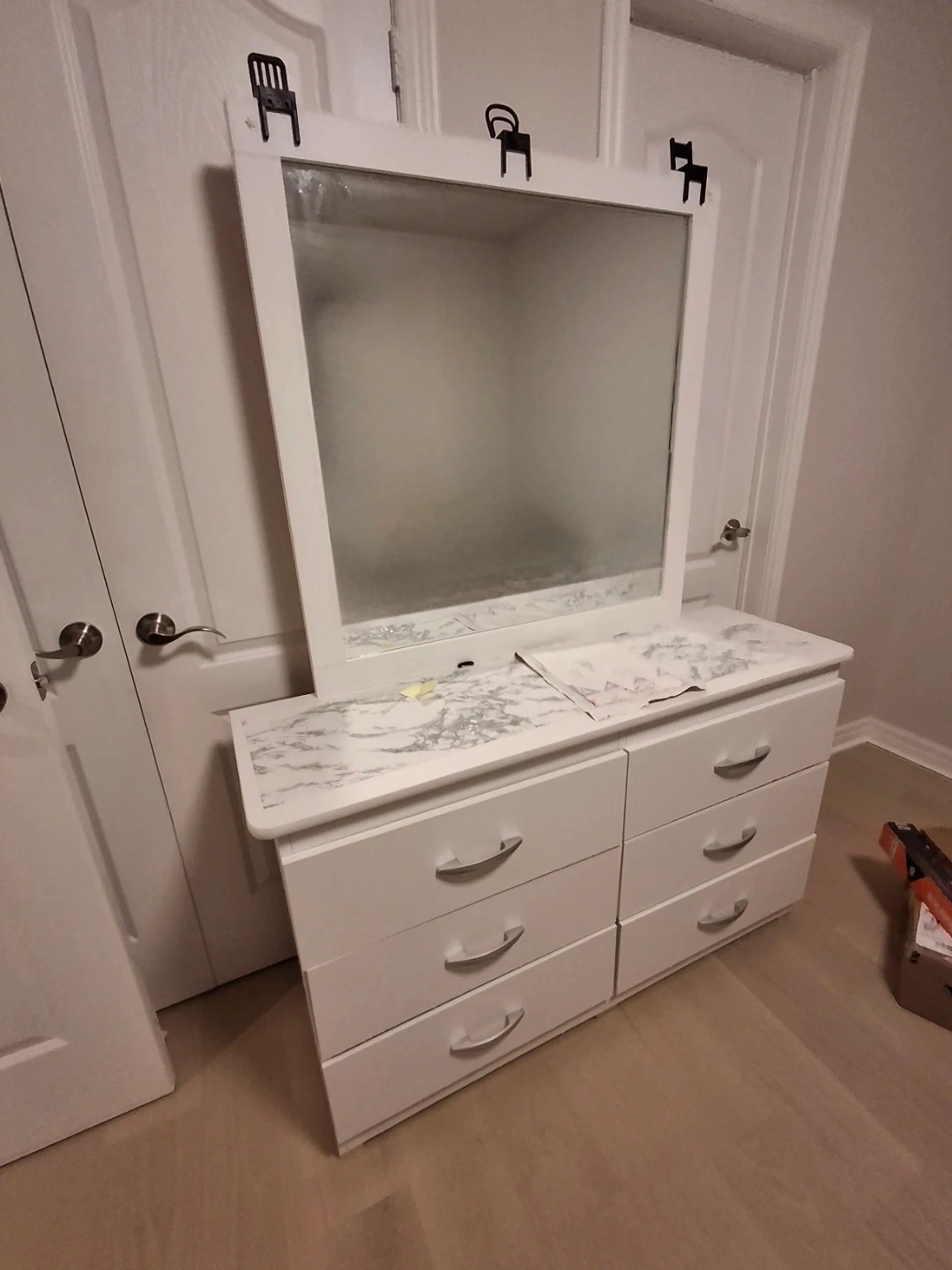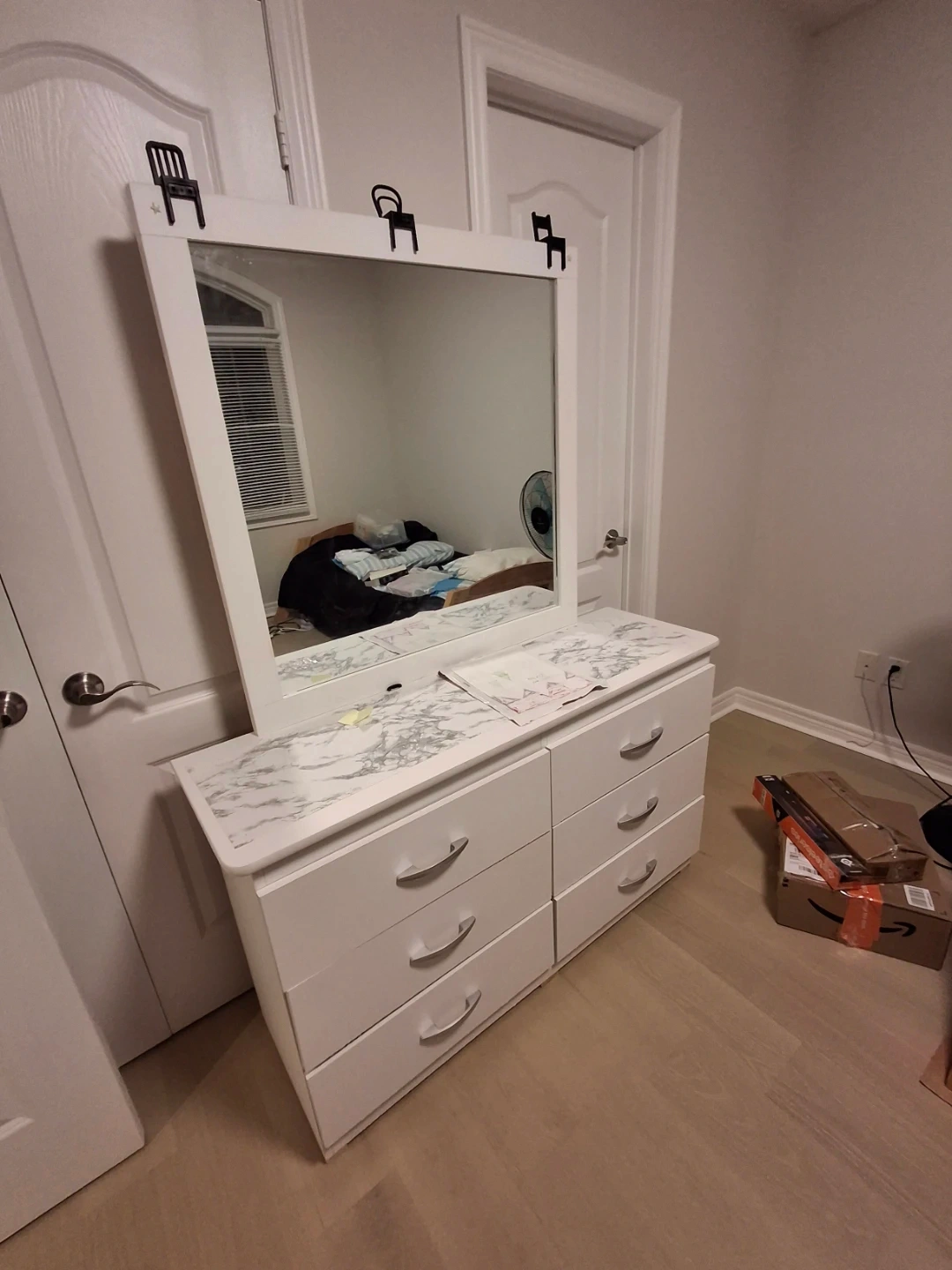 Selling a white desk and a white dresser with a mirror. Both are in great condition and would be perfect for a bedroom or home office. The desk is a great size for studying or working from home. The dresser has six drawers, providing plenty of storage space. It also features a mirror