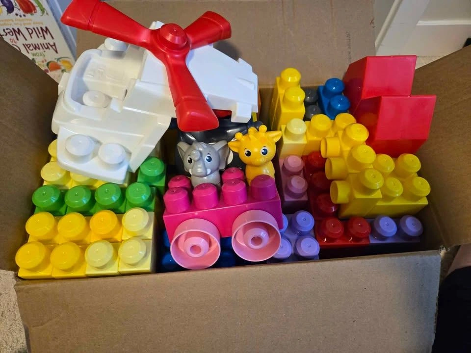 Selling my kids mega blocks. Had them in storage because they out grew. I counted 249 pieces. Still in great condition. Has a few animals,a pirate flag and helicopter attachment.