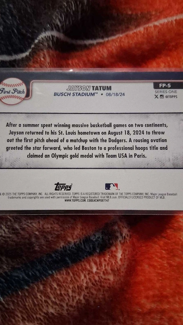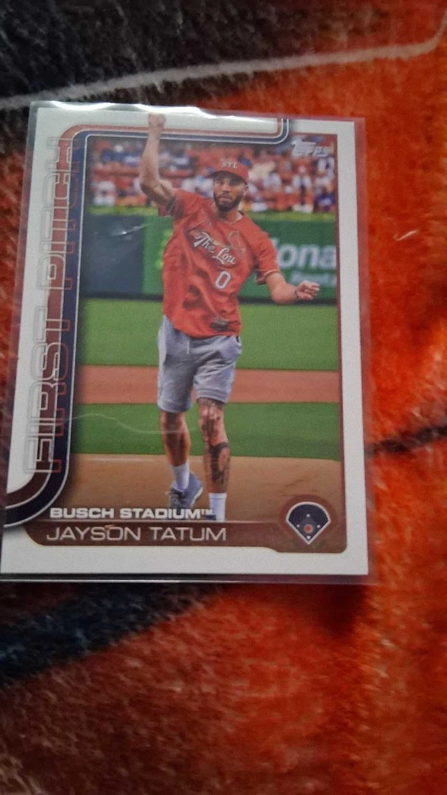 Selling my new MLB 2025 Topps Series 1 Jayson Tatum First Pitch card, #FP-5. Asking $5 cash, pick up only.